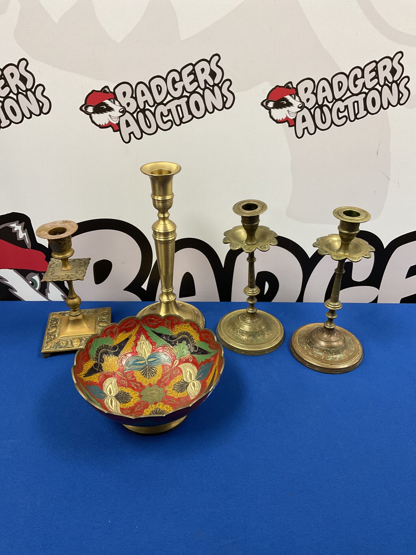 This lot comprises four vintage brass candlesticks and one Indian brass bowl. The candlesticks exhibit a classic, tapered form, suggesting a mid-20th-century origin. The bowl features intricate embossed detailing, typical of Indian brasswork, and likely served a decorative or ceremonial purpose. The warm tones of the brass and the detailed craftsmanship make this set a charming addition to any vintage or eclectic interior.