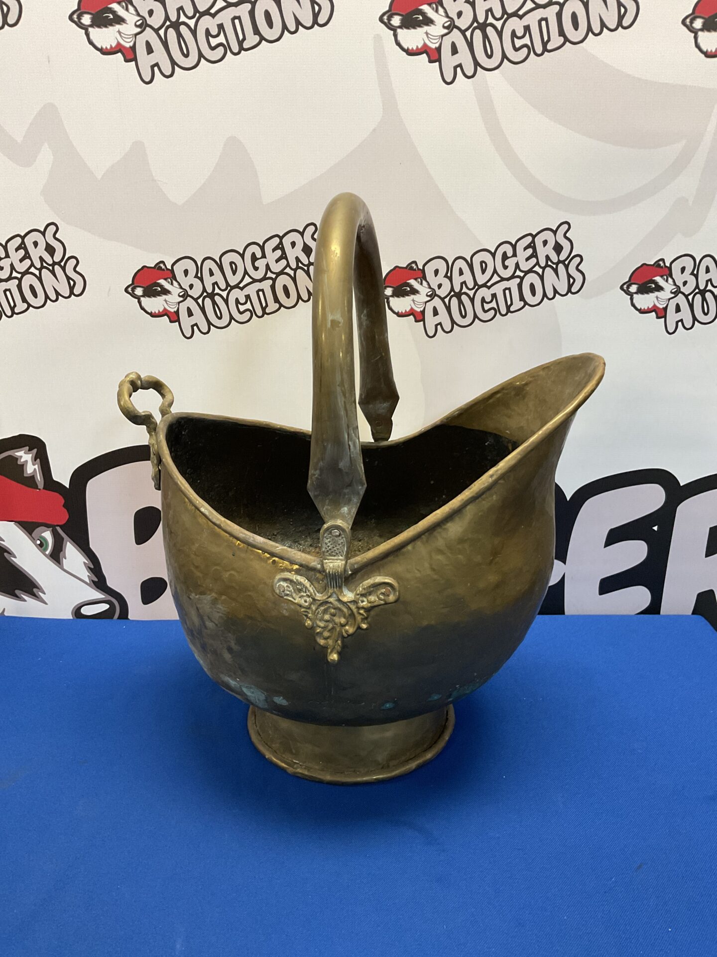 This coal scuttle shows signs of age and use, with some patina and wear to the brass surface, which is consistent with its vintage. It is a desirable piece for collectors of antique brassware or those seeking to add a touch of historical charm to their home decor. The scuttle’s aesthetic appeal and functional history make it a unique and interesting addition to any collection or fireside setting.