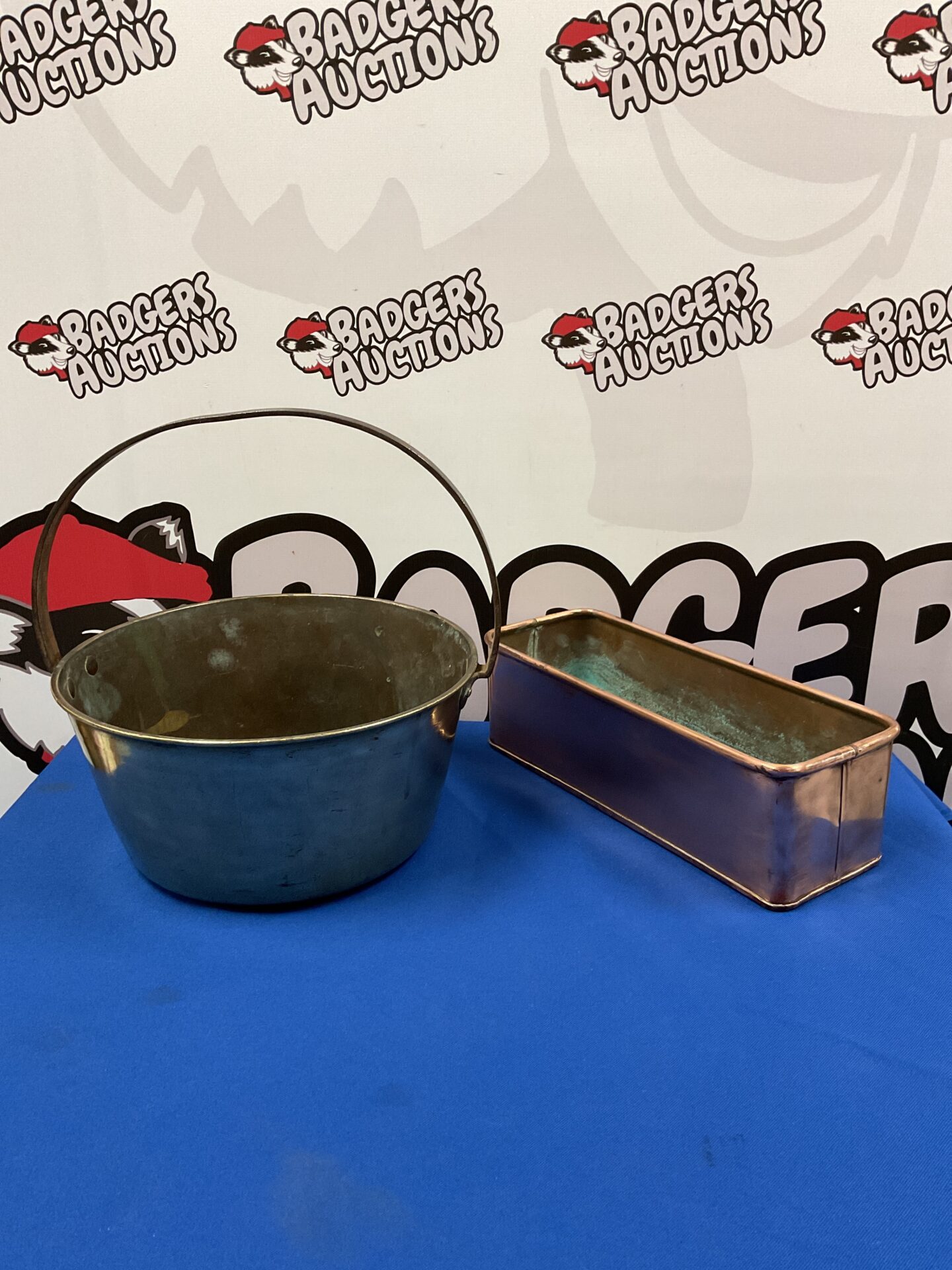 This antique item appears to be a heavy gauge brass jam pan, potentially repurposed or used alongside a copper trough planter. The brass pan exhibits a classic, rounded form, suggesting it was originally designed for cooking preserves or similar culinary applications. The copper trough, while appearing weathered, could have served as a decorative element or a container for plants, adding a rustic charm to any setting.