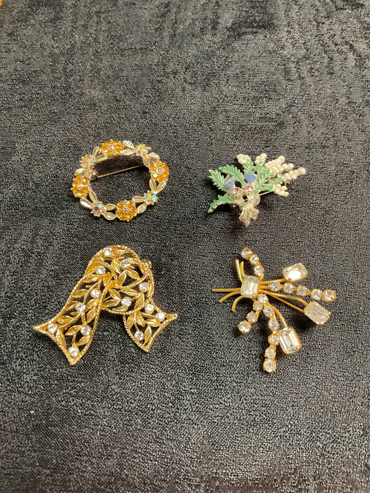 This lot comprises four vintage brooches, each displaying unique characteristics and craftsmanship. The brooches feature a variety of designs, including floral motifs and geometric patterns, crafted with materials like metal and potentially enamel or glass accents. These pieces likely date from the mid-20th century, reflecting the popular styles of the era, and would have been worn as fashionable accessories to complement outfits.