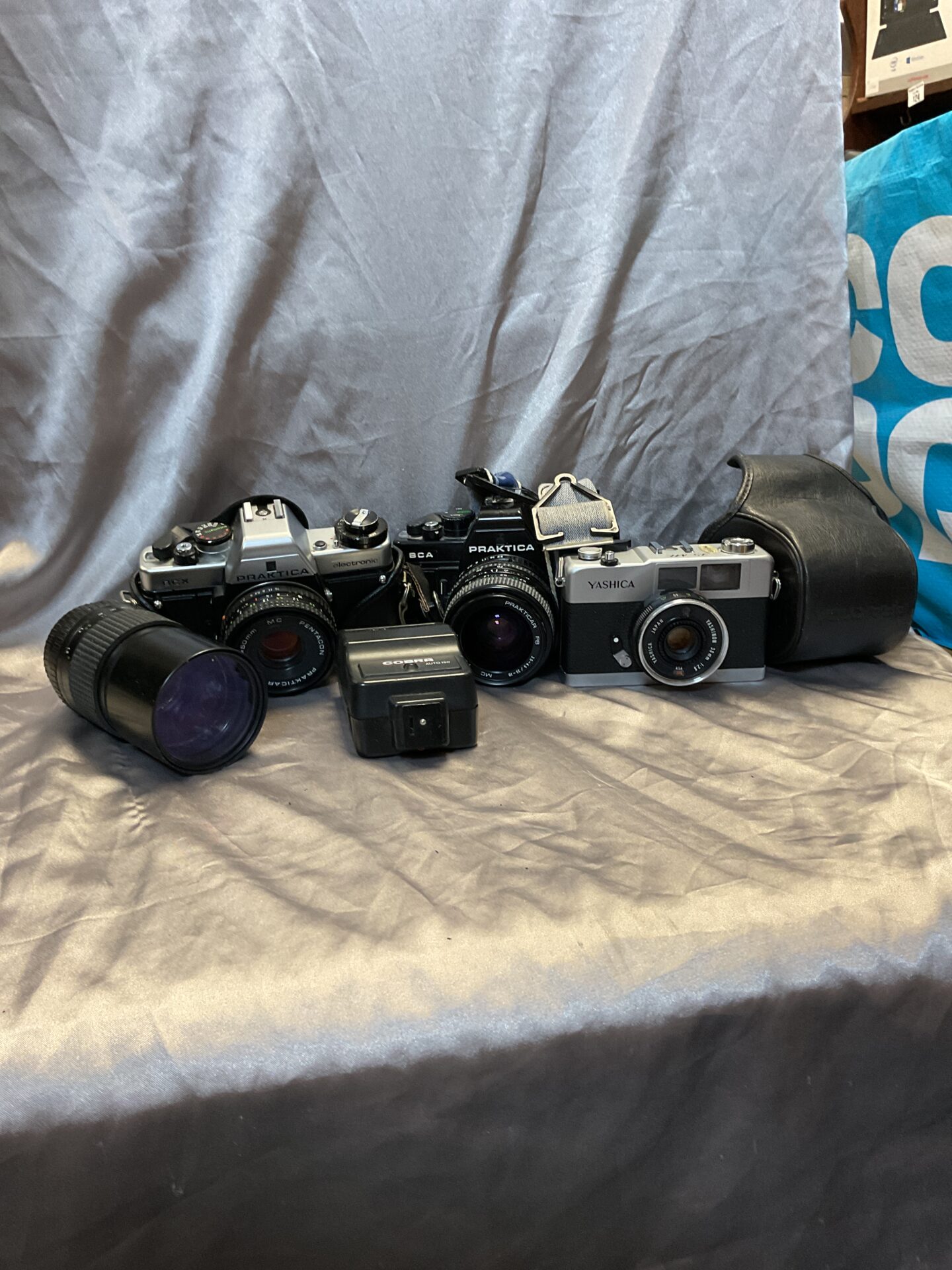 This lot comprises a selection of vintage cameras, including examples from Praktica and Yashica. These cameras represent a fascinating glimpse into the history of photography, showcasing the design and technology of their respective eras. The bundle includes various camera bodies and potentially lenses, offering a diverse range for collectors or enthusiasts.