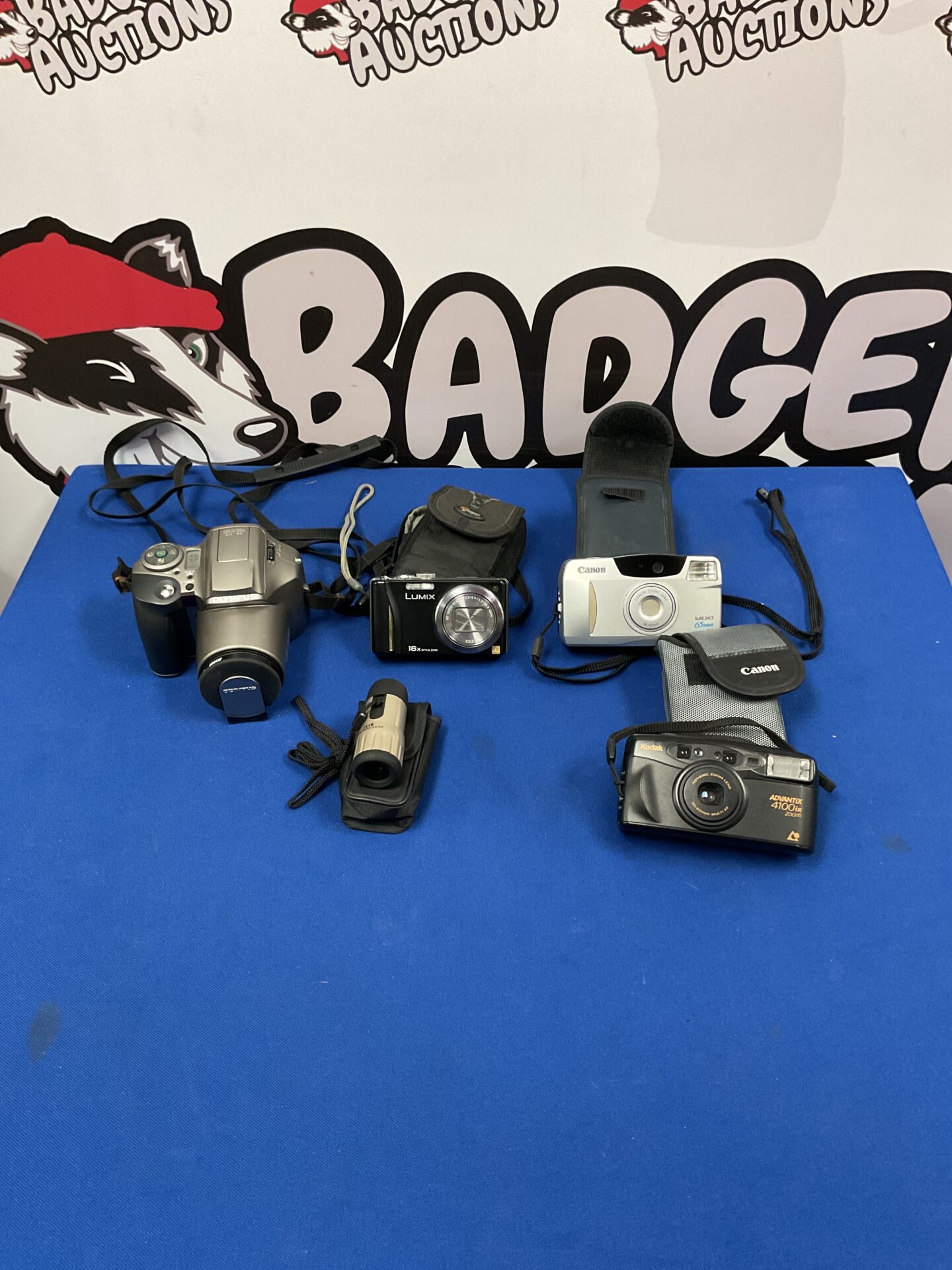 This lot comprises four point-and-shoot cameras, representing a variety of brands and styles. Included are a Kodak Advantix, a Canon Sure Shot, a Panasonic Lumix, and an Olympus IS-300. Each camera offers a unique approach to capturing moments, showcasing the evolution of compact camera technology.
