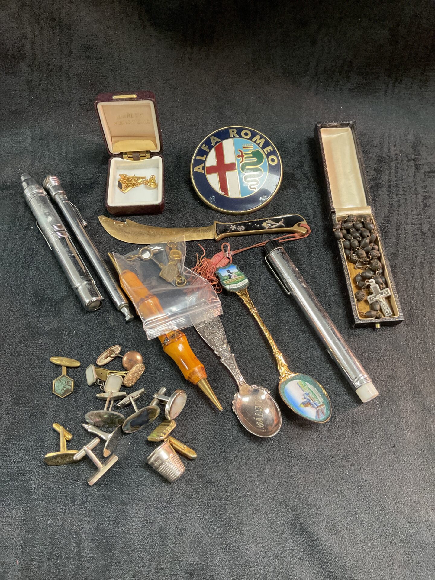 This lot comprises a collection of vintage automotive-themed items, including car badges, cufflinks, a spoon, and rosary beads. The collection appears to represent a variety of eras and potentially different manufacturers, offering a glimpse into the history of motoring and associated accessories. The items showcase craftsmanship and design typical of their respective periods, appealing to enthusiasts and collectors of automotive history.