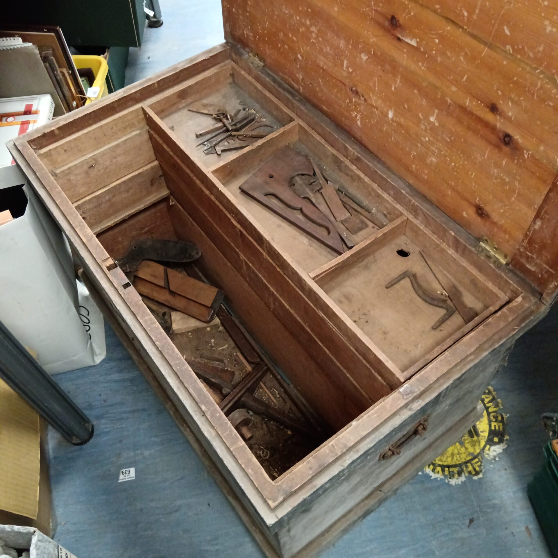 This large, robust tool chest presents a classic example of carpentry storage from a bygone era. Constructed from solid wood, it features a hinged lid and a spacious interior designed to house a comprehensive set of tools. The chest’s weathered appearance suggests years of use in a workshop or on a building site, adding to its character and appeal. Its substantial size indicates it was intended for a professional carpenter or serious hobbyist.