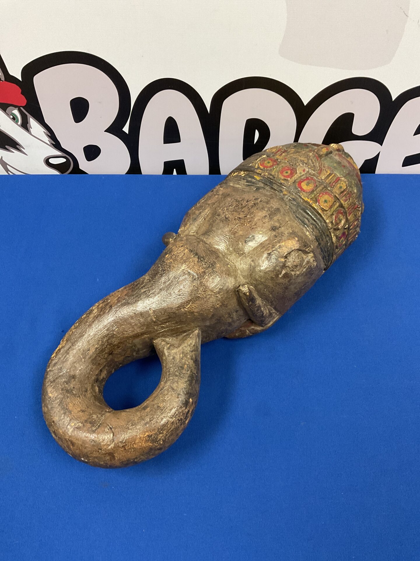 This striking piece is a vintage, hand-carved wooden mask depicting the Hindu deity Ganesh. The mask features an elongated trunk curling upwards, detailed facial features, and a textured surface indicative of traditional carving techniques. The mask’s construction suggests it was likely used in ritualistic or ceremonial contexts, showcasing the artistry and spiritual significance of African tribal art.
