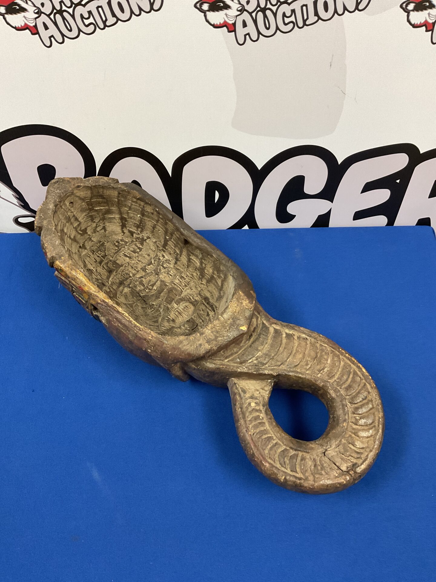 The mask exhibits signs of age and wear, including surface patina and minor imperfections, which contribute to its authentic vintage character. While showing its age, the mask remains structurally sound and retains its artistic integrity. This piece would be a valuable addition to a collection of ethnographic art, tribal masks, or religious sculptures, appealing to collectors and enthusiasts of cultural artifacts.