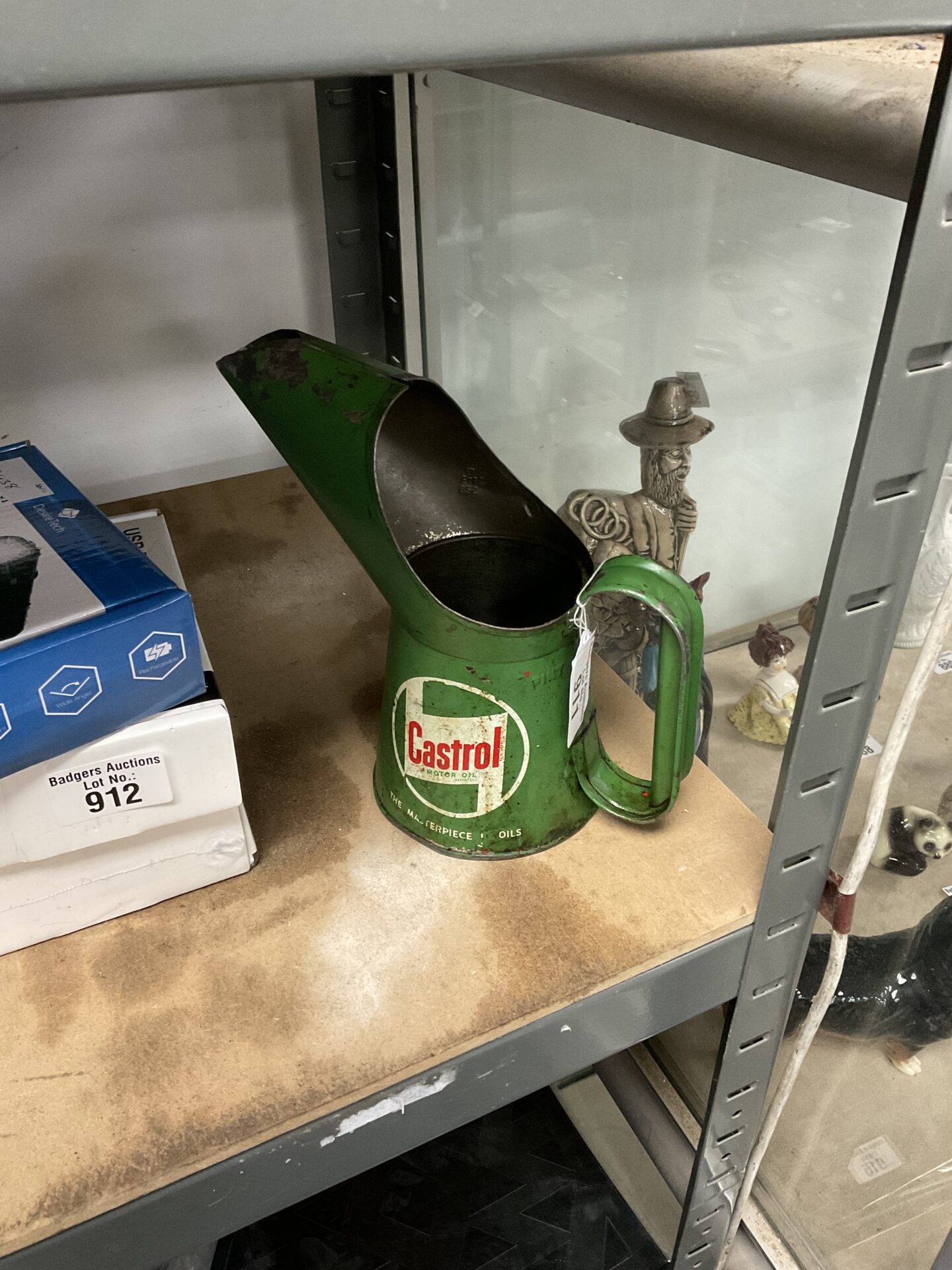 This is a vintage half-pint Castro oil can, displaying the iconic Castro branding. The can is constructed from metal and features a traditional spout design for controlled dispensing. Its vibrant colours and classic aesthetic reflect the era of early automotive and mechanical lubrication, making it a nostalgic piece for enthusiasts.