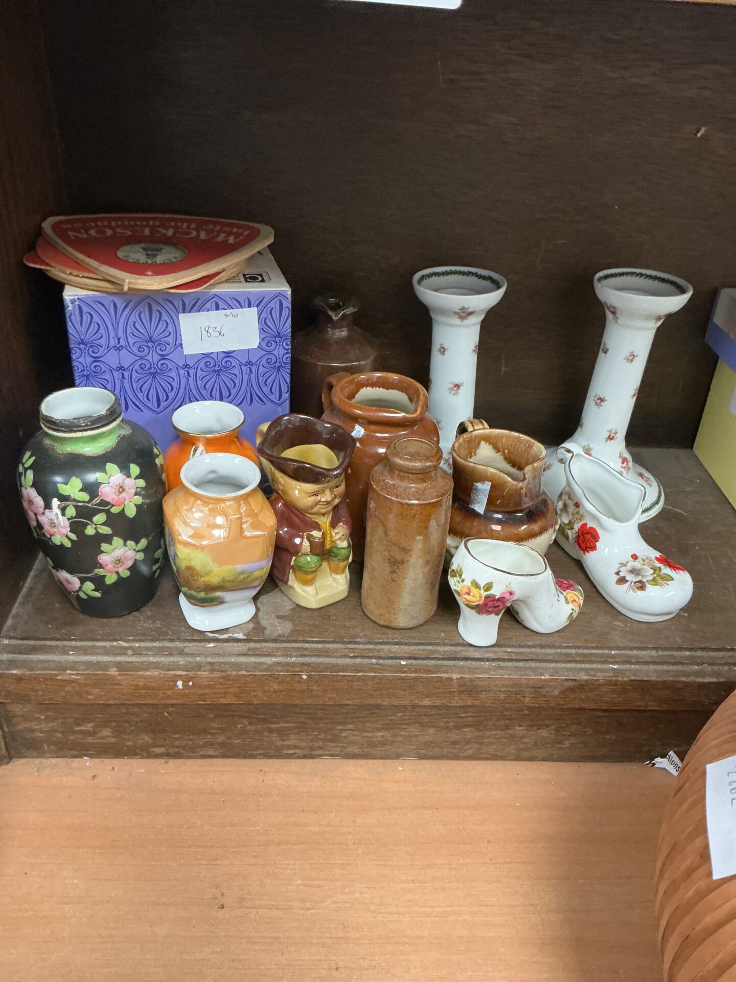 This lot comprises a charming selection of vintage ceramic figures and small vases, showcasing a variety of styles and designs. The collection includes floral-decorated pieces, potentially dating back to the mid-20th century, and features a mix of shapes and sizes, ideal for display or adding a touch of retro charm to any home. The pieces exhibit a range of glazes and decorative techniques, suggesting they were crafted with attention to detail and artistic flair.