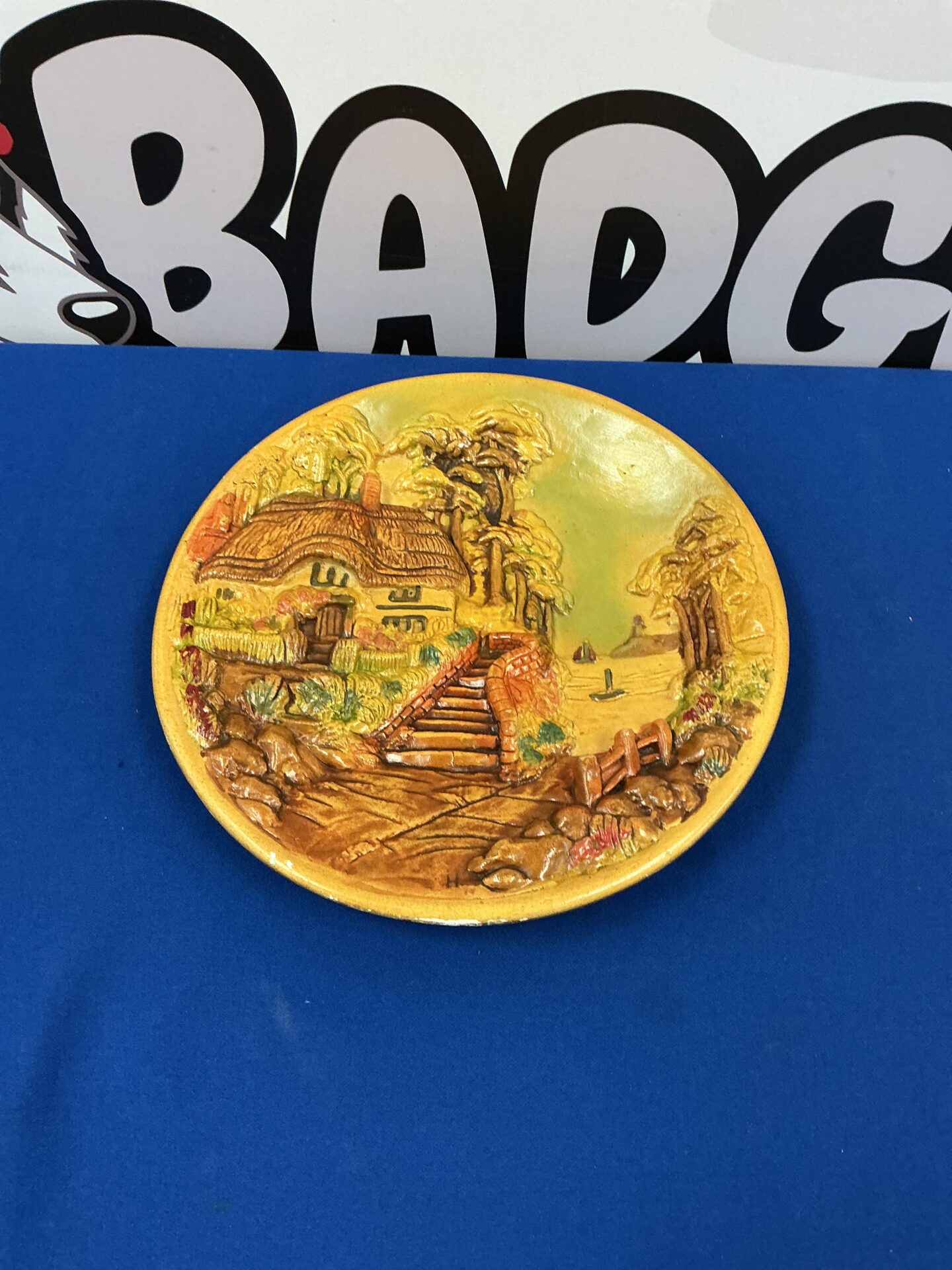 This vintage Boston chalkware wall hanging features a detailed landscape scene with a charming cottage. A delightful piece of mid-century decor, it adds a touch of retro charm to any space. Perfect for collectors or those seeking unique vintage wall art.