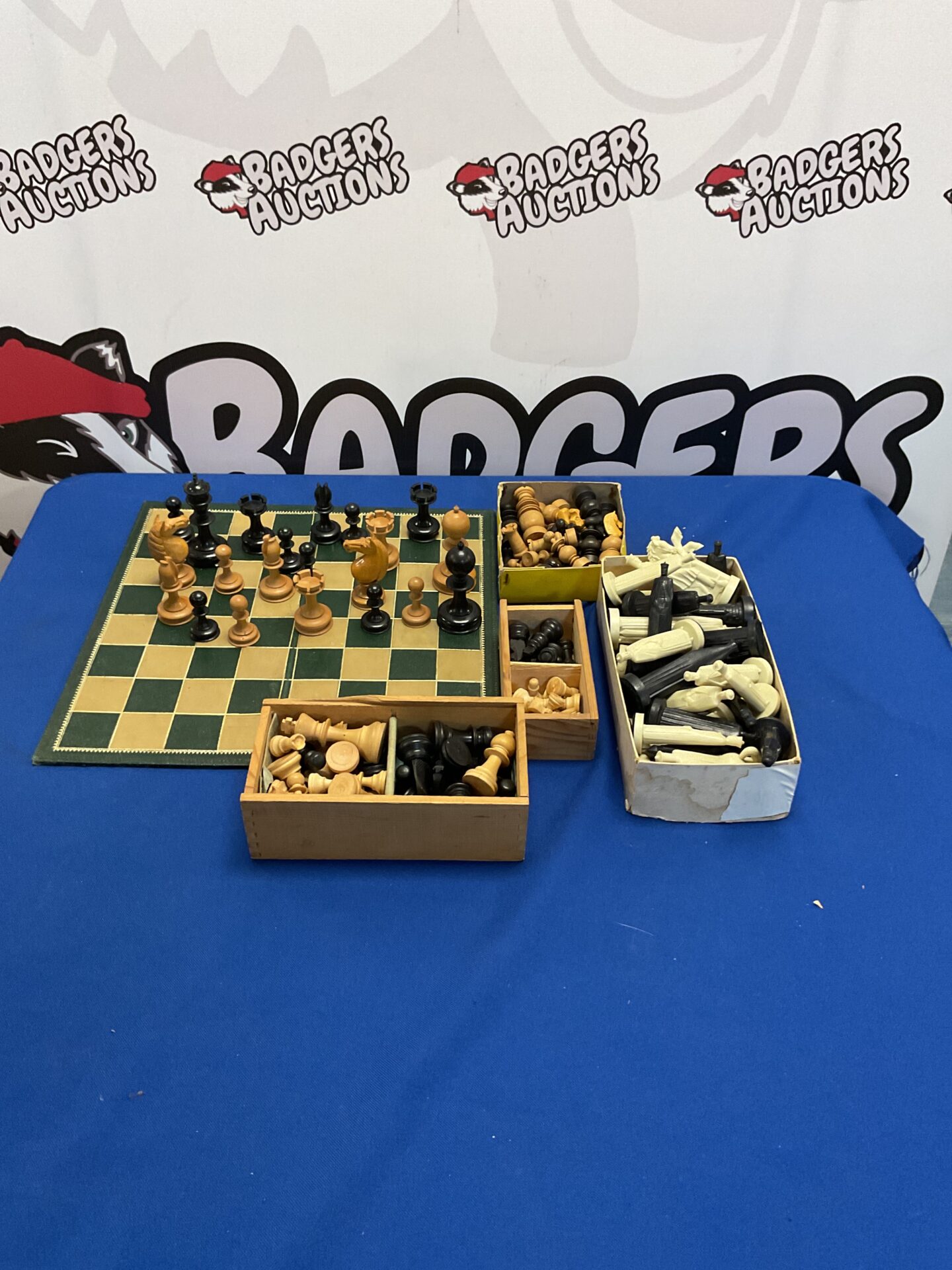The sets appear to be pre-owned, with varying degrees of wear and tear commensurate with age. While the condition is not pristine, this adds to the vintage charm and character of the collection. This lot would appeal to chess enthusiasts, collectors of antique games, or those seeking unique decorative items for a home or games room.
