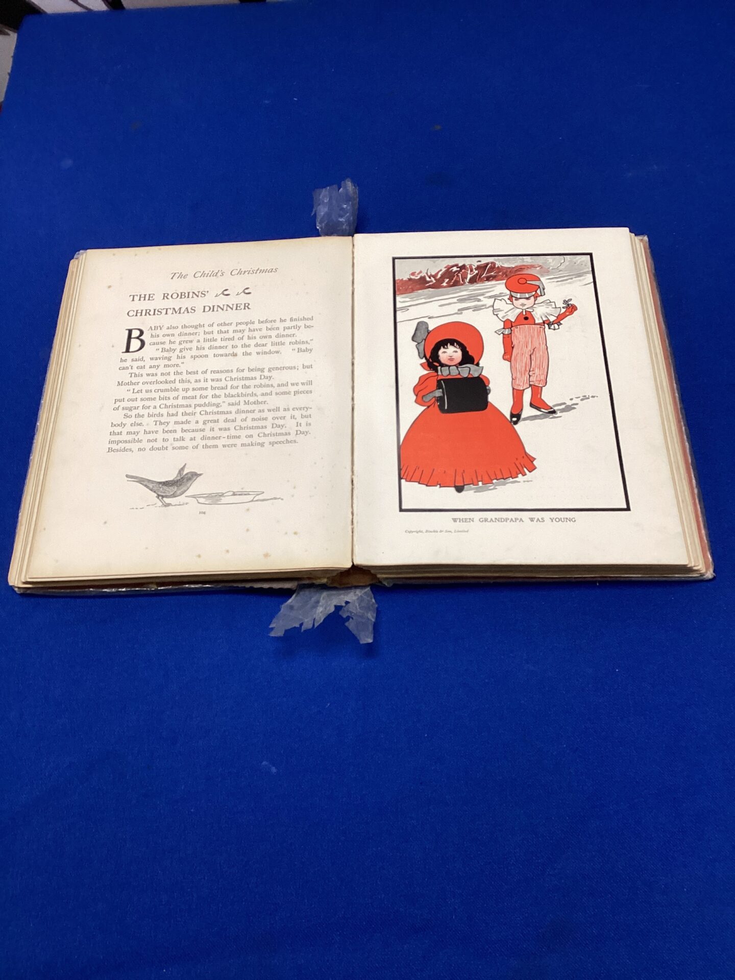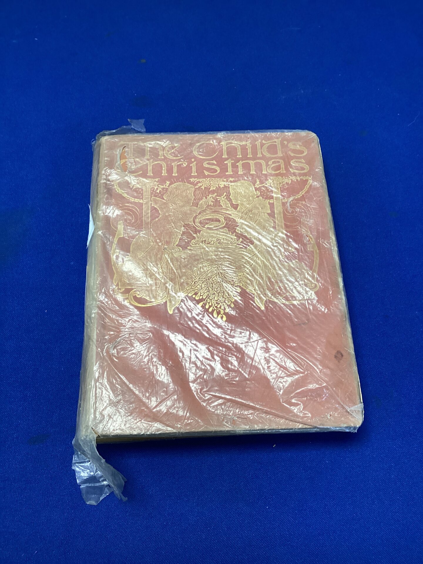 This is a lovely vintage copy of “The Child’s Christmas”, a beautifully illustrated book evoking the spirit of a Victorian Christmas. The cover features embossed gold detailing and a decorative design, typical of the era. The book’s pages are filled with charming illustrations and likely contain classic Christmas stories and poems intended for children.