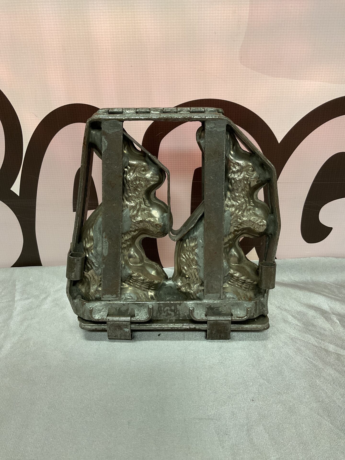 This is a vintage chocolate mould, depicting charming bunny rabbits. Constructed from metal, this mould would have been used to create delightful chocolate treats, likely for Easter or other celebrations. The detailed design features multiple bunnies, suggesting a larger, more elaborate chocolate creation. It’s a wonderful example of a bygone era of confectionery craftsmanship.