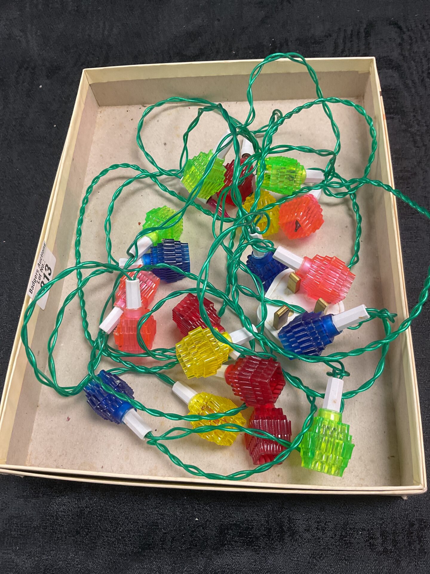 This set features a string of colourful lantern-style Christmas lights. The lights are constructed with plastic lantern-shaped covers in shades of red, green, and yellow. These lights likely date to the mid-century period, offering a nostalgic touch to holiday decorations.