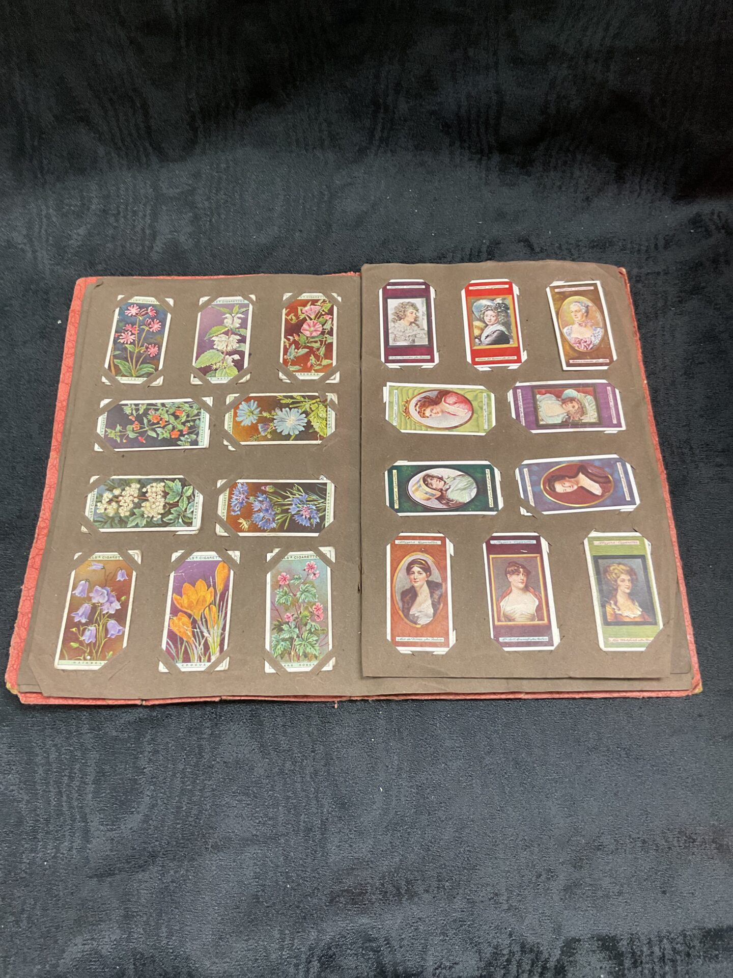 This is a vintage album filled with collectible cigarette cards. The album features a variety of themes, including floral studies, portraits of women, heraldic emblems, and depictions of wildlife. The cards are neatly arranged within protective sleeves, showcasing a diverse collection accumulated over time. The album itself is bound with a red cover, suggesting a period aesthetic.