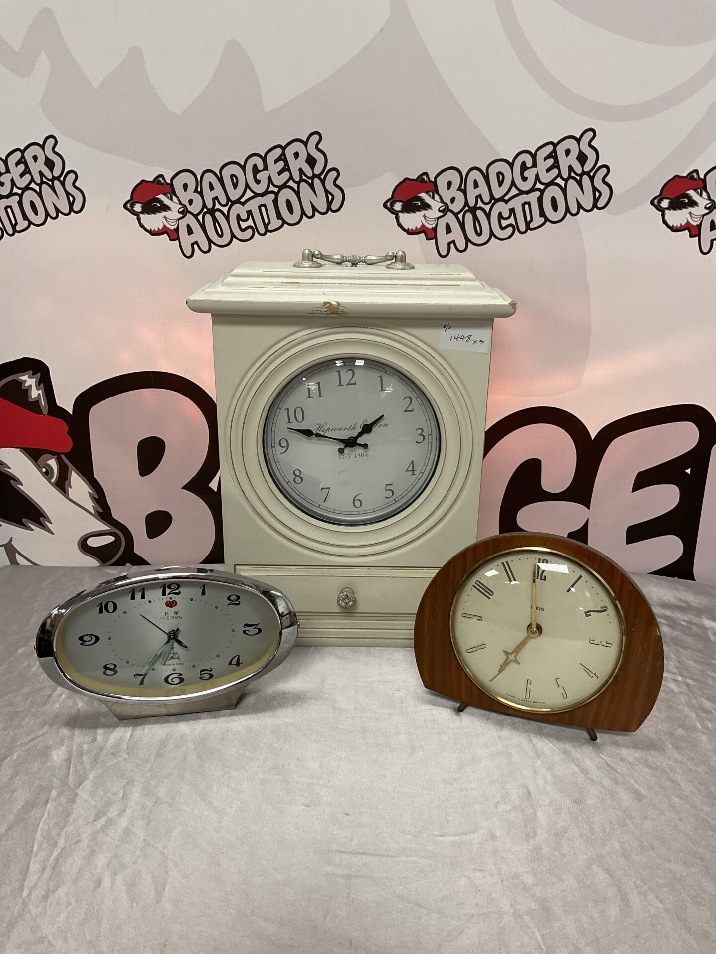 This lot comprises three vintage clocks, representing a selection of British manufacturers. Included are examples from Smiths, Five Rams, and Hepworth & Son. Each clock exhibits the design aesthetics typical of their respective eras, offering a glimpse into the history of timekeeping and domestic design.