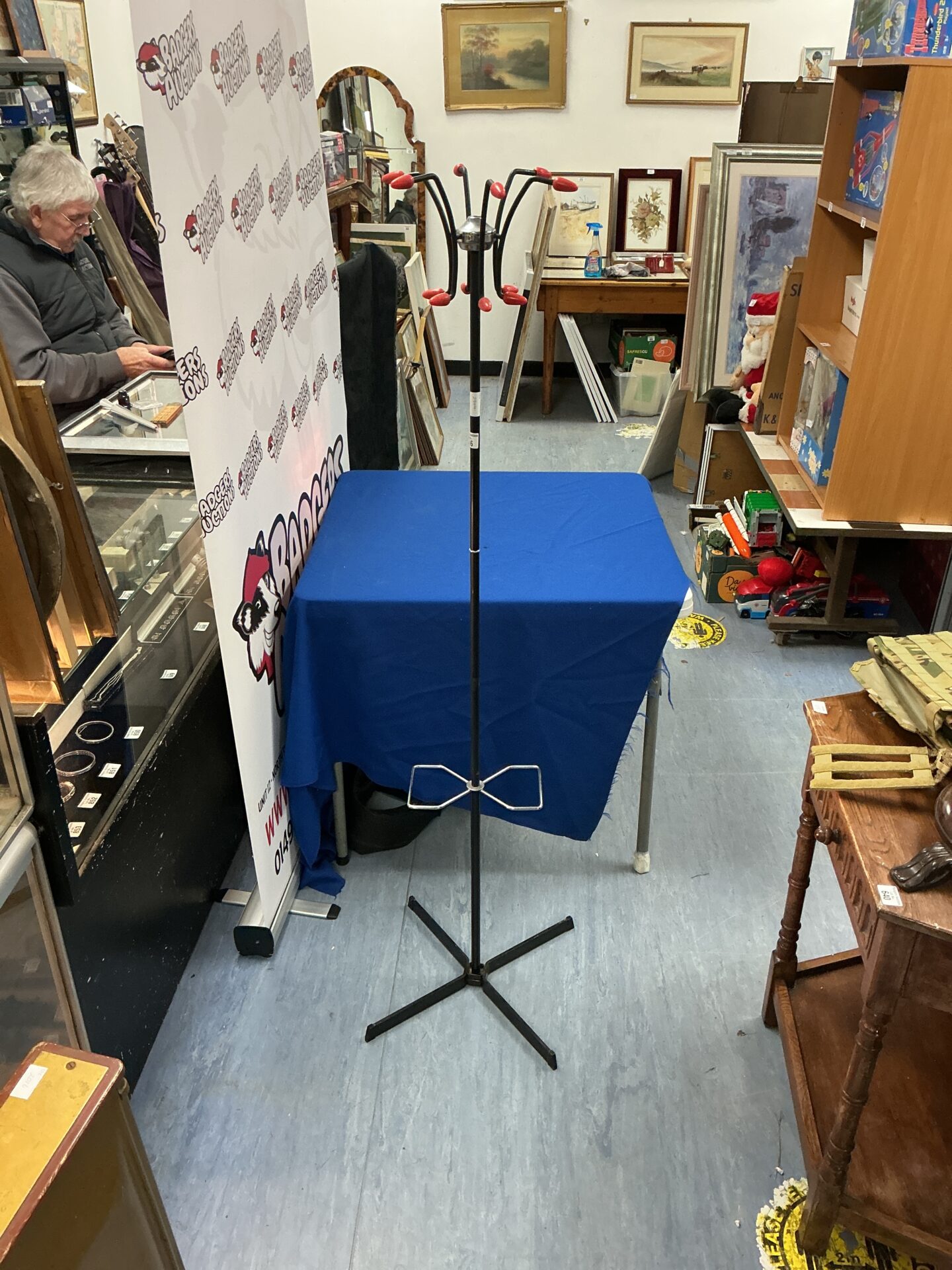 This striking coat and hat stand presents a classic mid-century modern design. Constructed from metal, it features a central pole with multiple arms extending outwards to accommodate coats, jackets, and hats. The stand’s base consists of four angled legs, providing stability and a visually appealing geometric form. This piece would have been a stylish addition to any hallway or bedroom during its era.