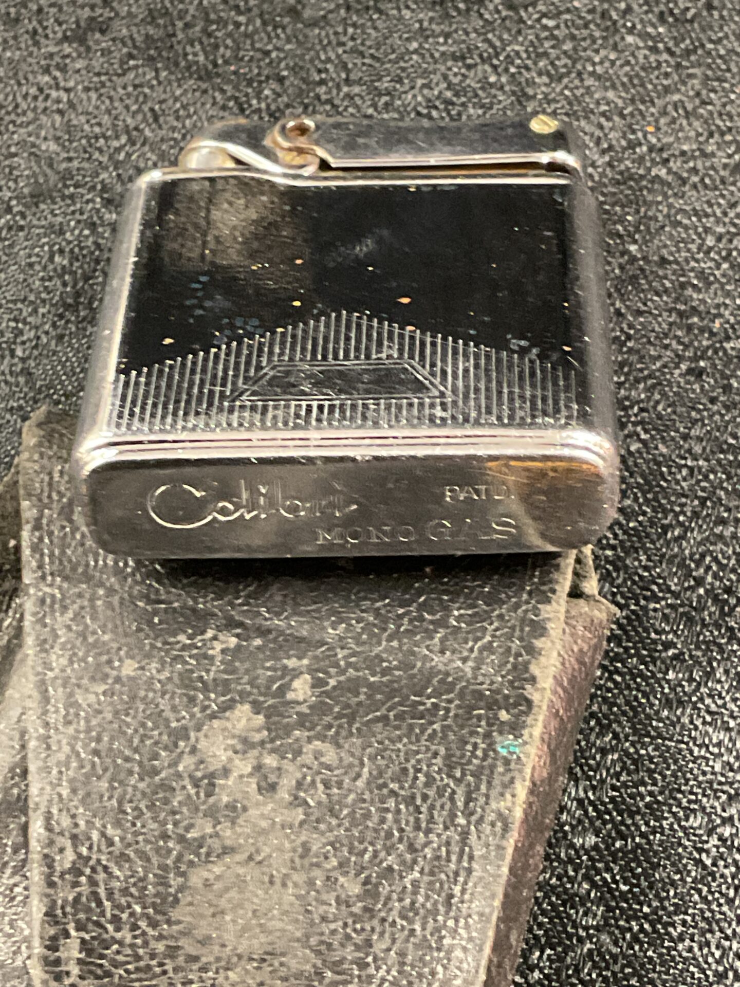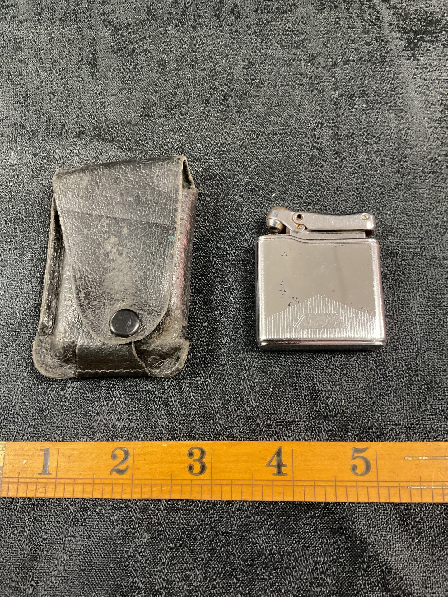 The lighter and case exhibit signs of age and use, with surface wear and patina consistent with their vintage. The leather case shows creasing and wear, while the lighter itself may exhibit minor scratches or blemishes. Despite these signs of wear, the lighter retains its original character and appeal, making it a desirable piece for collectors of vintage smoking accessories or military memorabilia. The combination of the lighter and its case adds to its collectibility and historical significance.