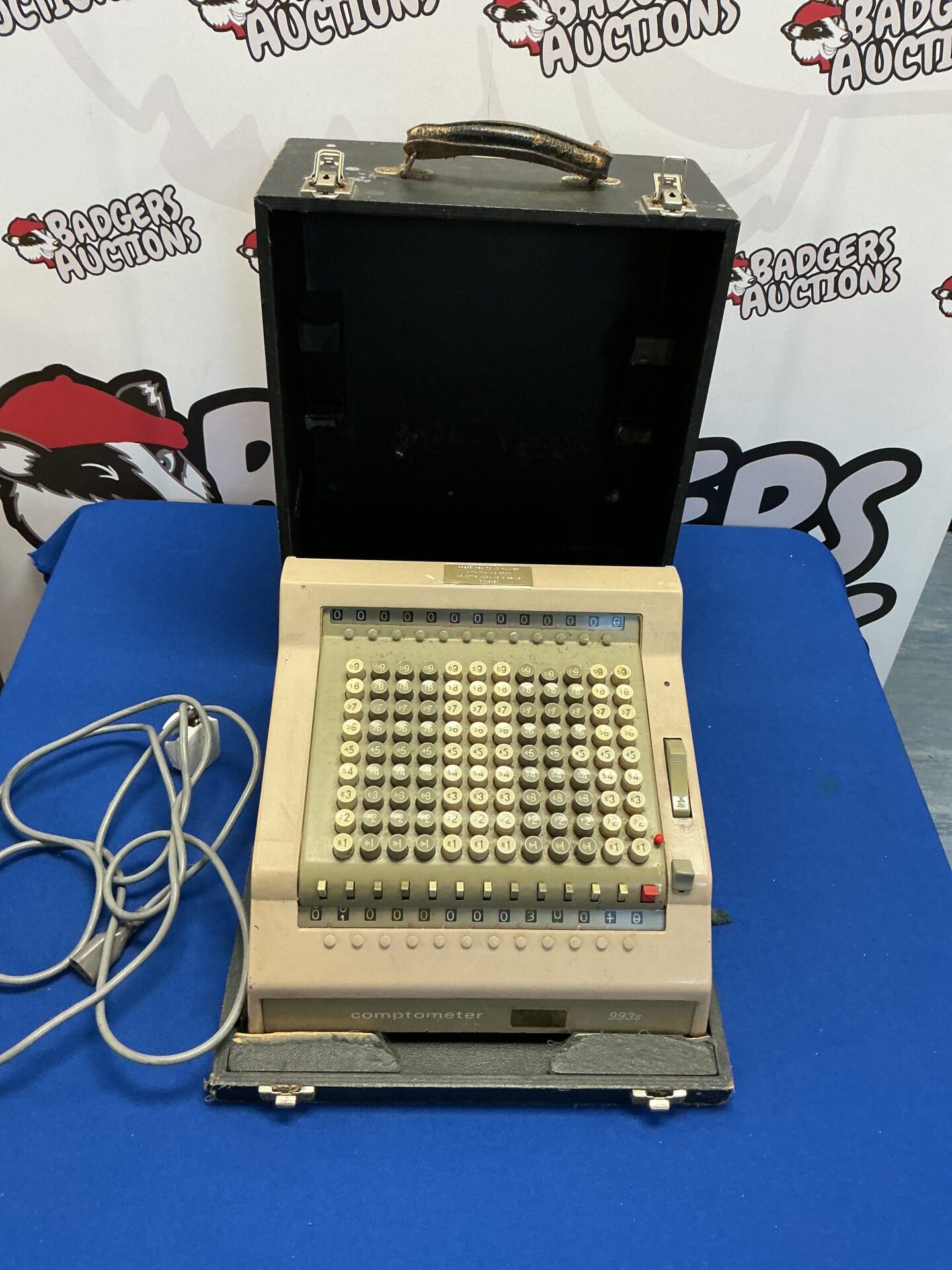 This Comptometer 993s is presented in its original carrying case, adding to its appeal for collectors. The calculator shows signs of age and use, consistent with its vintage, and may require cleaning or restoration. Despite this, it remains a visually striking and historically significant item, ideal for display, study, or as a unique addition to a collection of antique office equipment.