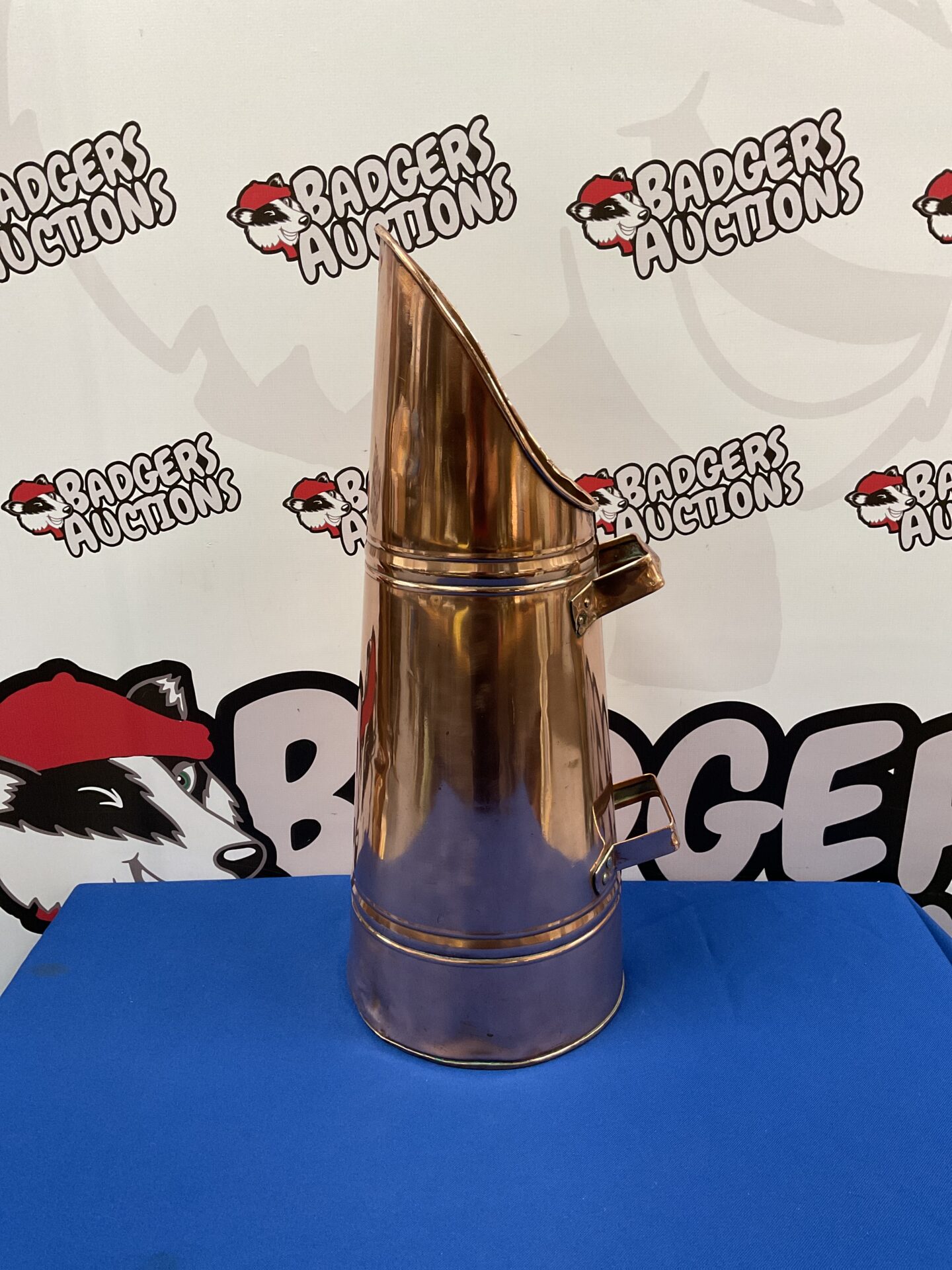This is a vintage copper coal scuttle, featuring twin handles for easy carrying. The scuttle’s design is typical of those used in fireplaces to hold coal for fueling fires, and its copper construction adds a touch of warmth and character to any home. The scuttle’s form is functional yet aesthetically pleasing, making it a desirable piece for collectors of vintage fireplace accessories.