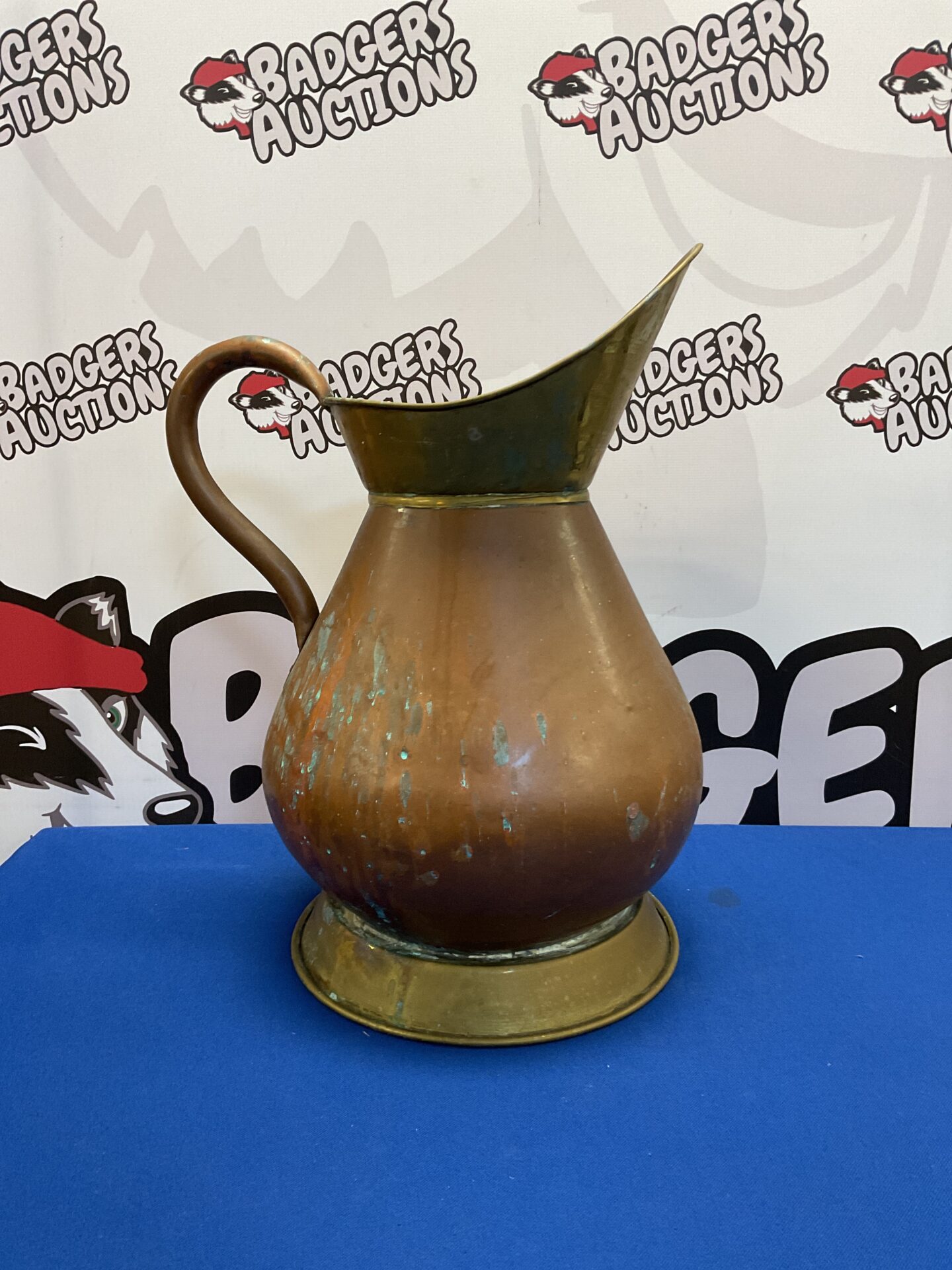 This is a striking vintage copper and brass haystack pitcher, showcasing a classic design popular in the late 19th and early 20th centuries. The pitcher features a bulbous body, reminiscent of a haystack, crafted from copper and accented with brass detailing around the base and handle. Its generous size and unique form make it a beautiful and functional piece, originally intended for serving water or other beverages. The patina on the copper adds to its rustic charm and character.