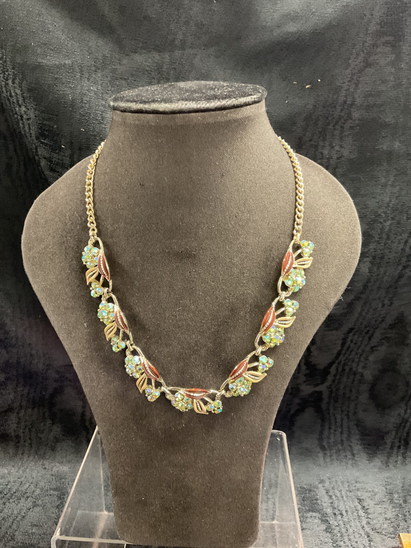 This vintage necklace shows signs of wear consistent with its age, which adds to its character and appeal. The crystals remain bright and intact, and the gold-tone metal displays a lovely patina. This piece would be a wonderful addition to a collection of vintage jewellery, particularly for those interested in 1950s fashion and accessories. It’s a statement piece that would add a touch of retro glamour to any outfit.