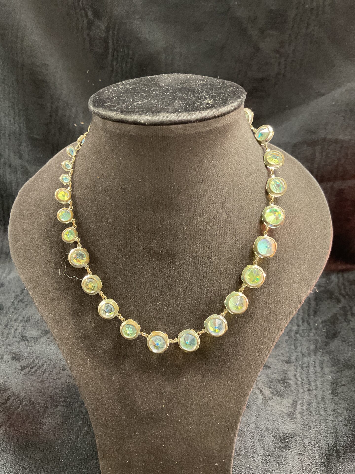 This vintage necklace shows signs of wear consistent with its age, adding to its character and charm. The gold tone shows some light wear, and the crystals are intact, though may exhibit minor surface scratches upon close inspection. This necklace would be a wonderful addition to a collection of vintage jewellery, or a statement piece for someone who appreciates retro style.