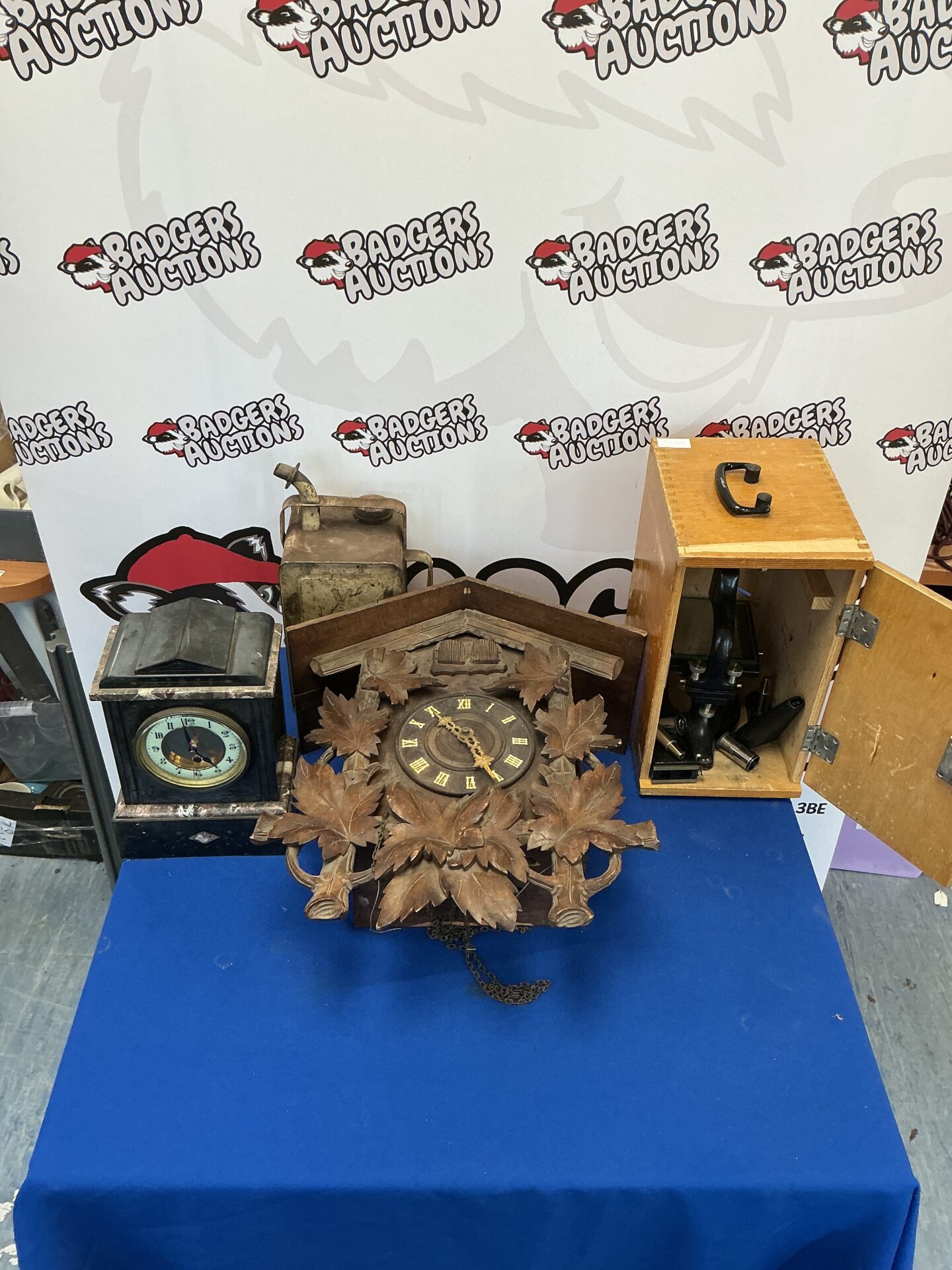 The clock appears to be in its original condition, with signs of age and wear consistent with a vintage item. While the clock’s functionality is not assessed, its aesthetic appeal and collectible nature make it an interesting piece for enthusiasts and collectors. The inclusion of the microscope, mantle clock, and oil can adds to the lot’s overall value and charm.
