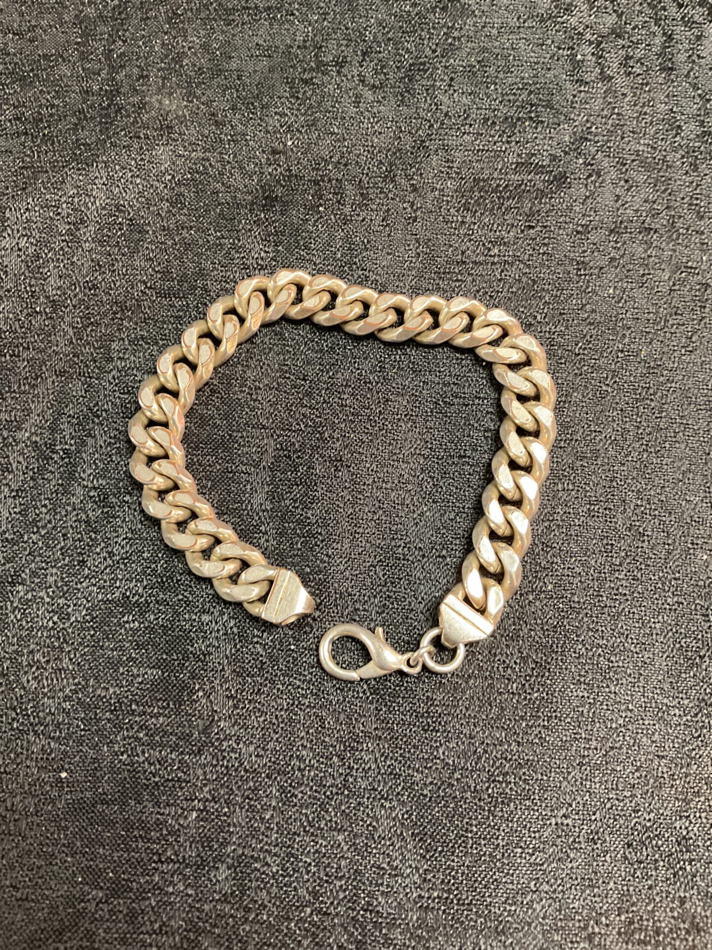 This striking bracelet features a bold, heavy curb link design, crafted from gold-tone metal. The substantial links create a statement piece, reminiscent of 1980s fashion. The secure lobster clasp ensures comfortable and reliable wear. This bracelet is a classic example of retro costume jewellery, designed to add a touch of glamour to any outfit.