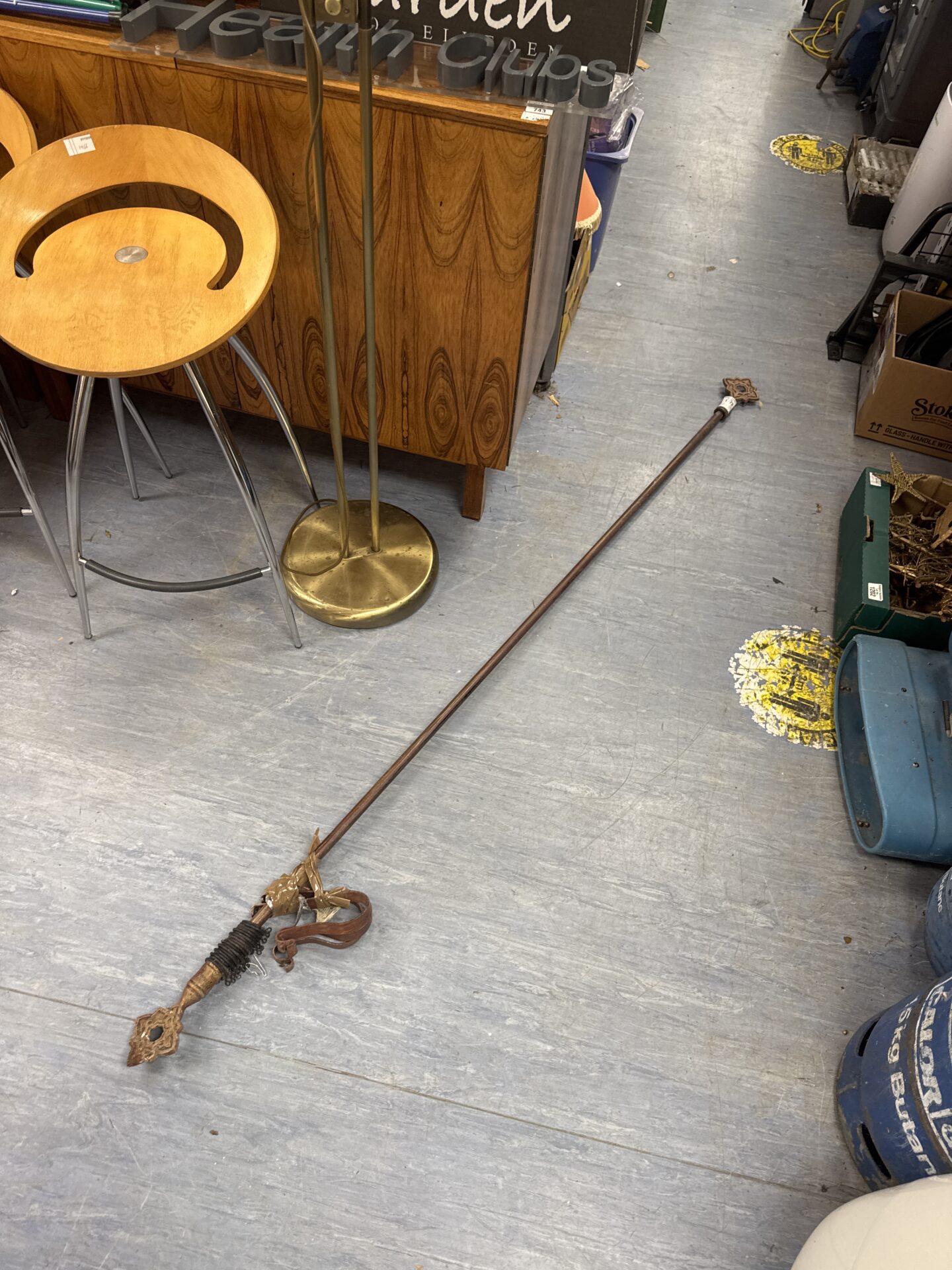 The curtain rail shows signs of age and use, with some rust present on one end. This patina adds to its vintage charm and character. Despite this, the rail appears structurally sound and could be restored or used as a decorative feature. Collectors of vintage home furnishings or those undertaking restoration projects may find this rail a desirable addition.