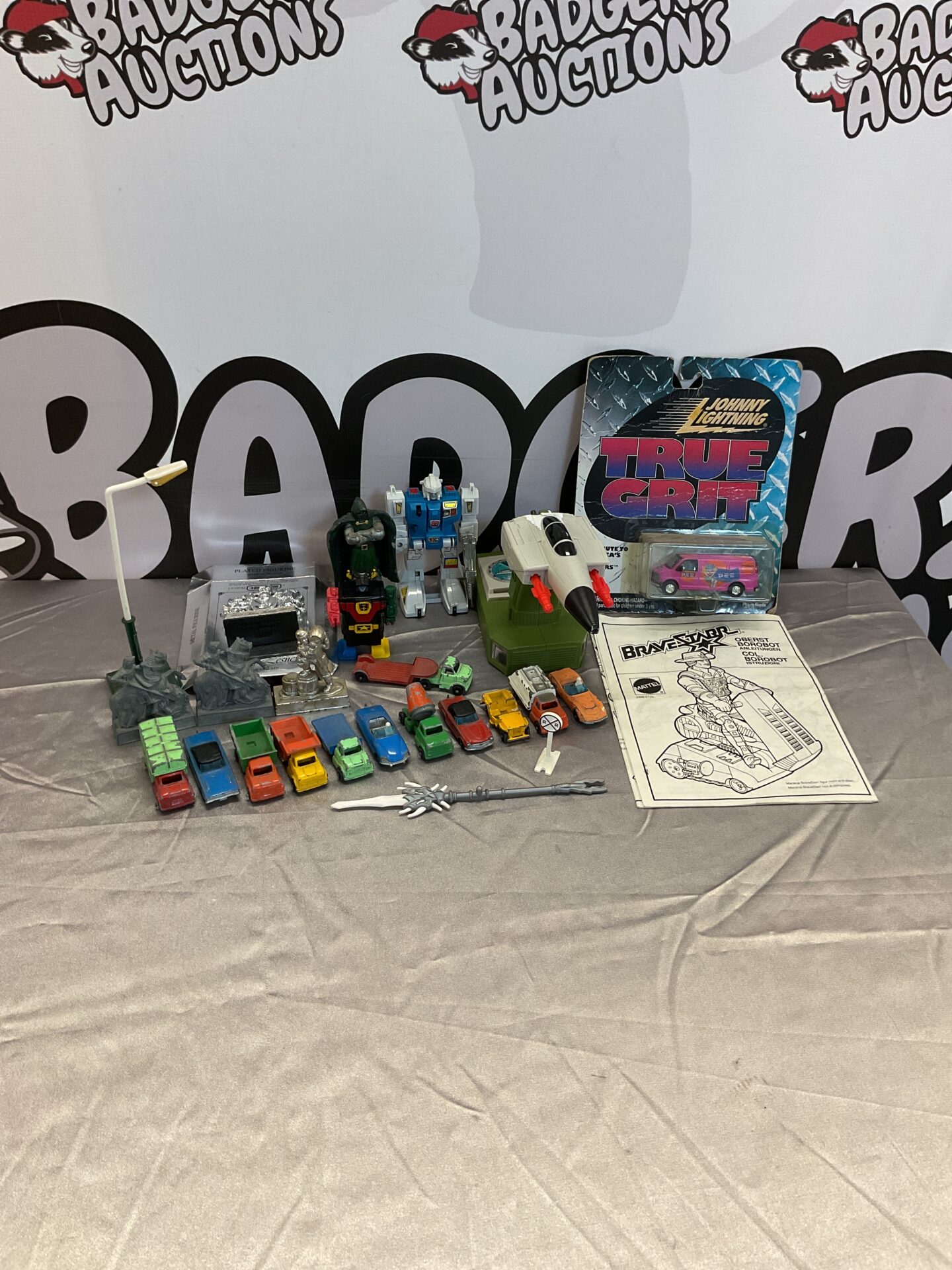This lot comprises a collection of vintage diecast toys, including examples from Johnny Lightning, Lesney, and Lone Star. The collection features a variety of vehicles and figures, representing a nostalgic glimpse into toy manufacturing from past decades. These toys showcase the design aesthetics and craftsmanship of their respective eras, appealing to collectors and enthusiasts alike.