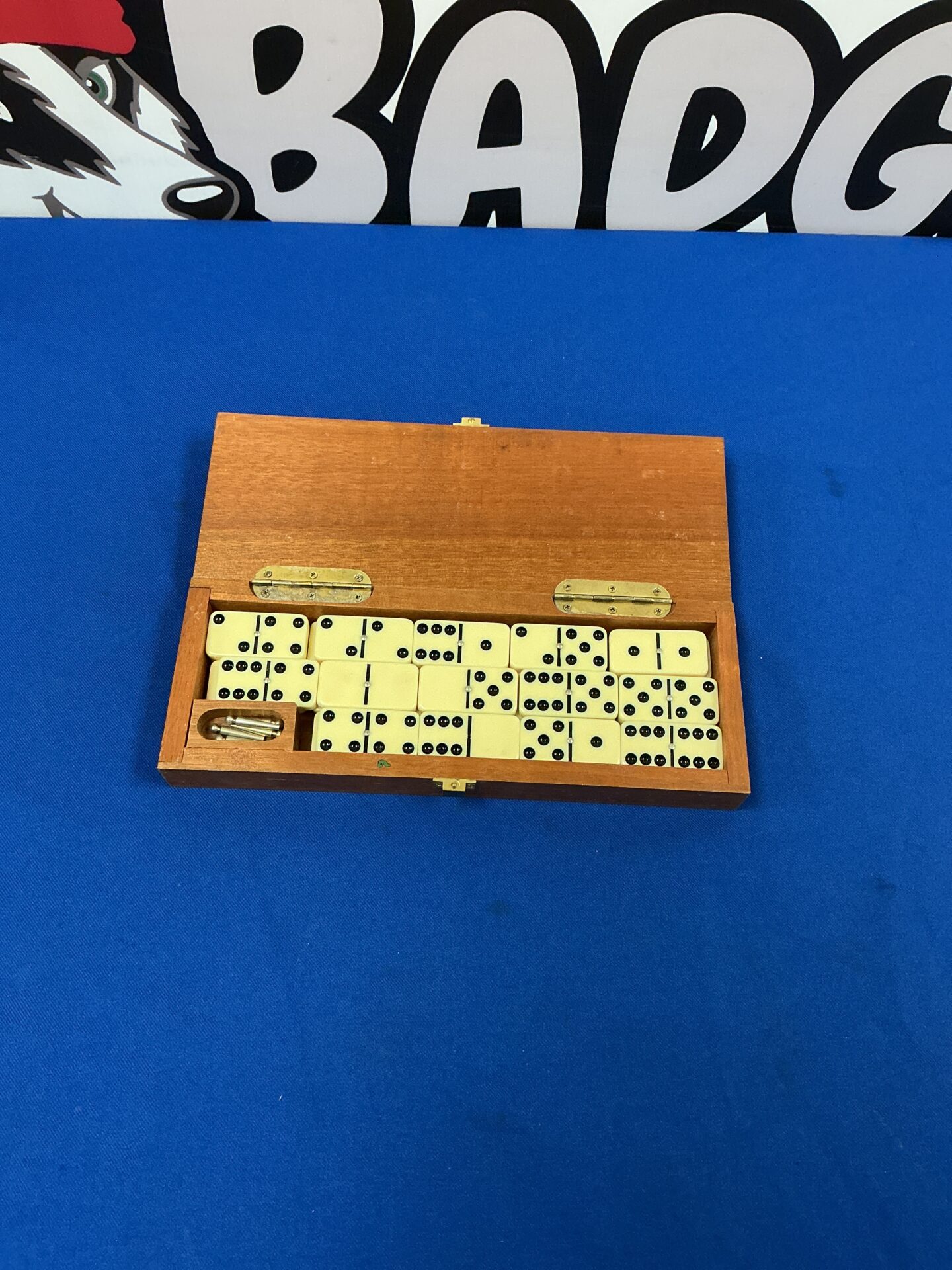 This set shows signs of age and use, consistent with its vintage nature. The wood exhibits a warm patina, and there may be minor wear or imperfections to both the board and the dominoes. This set would appeal to collectors of vintage games, domino enthusiasts, or those seeking a unique and nostalgic addition to their game collection.