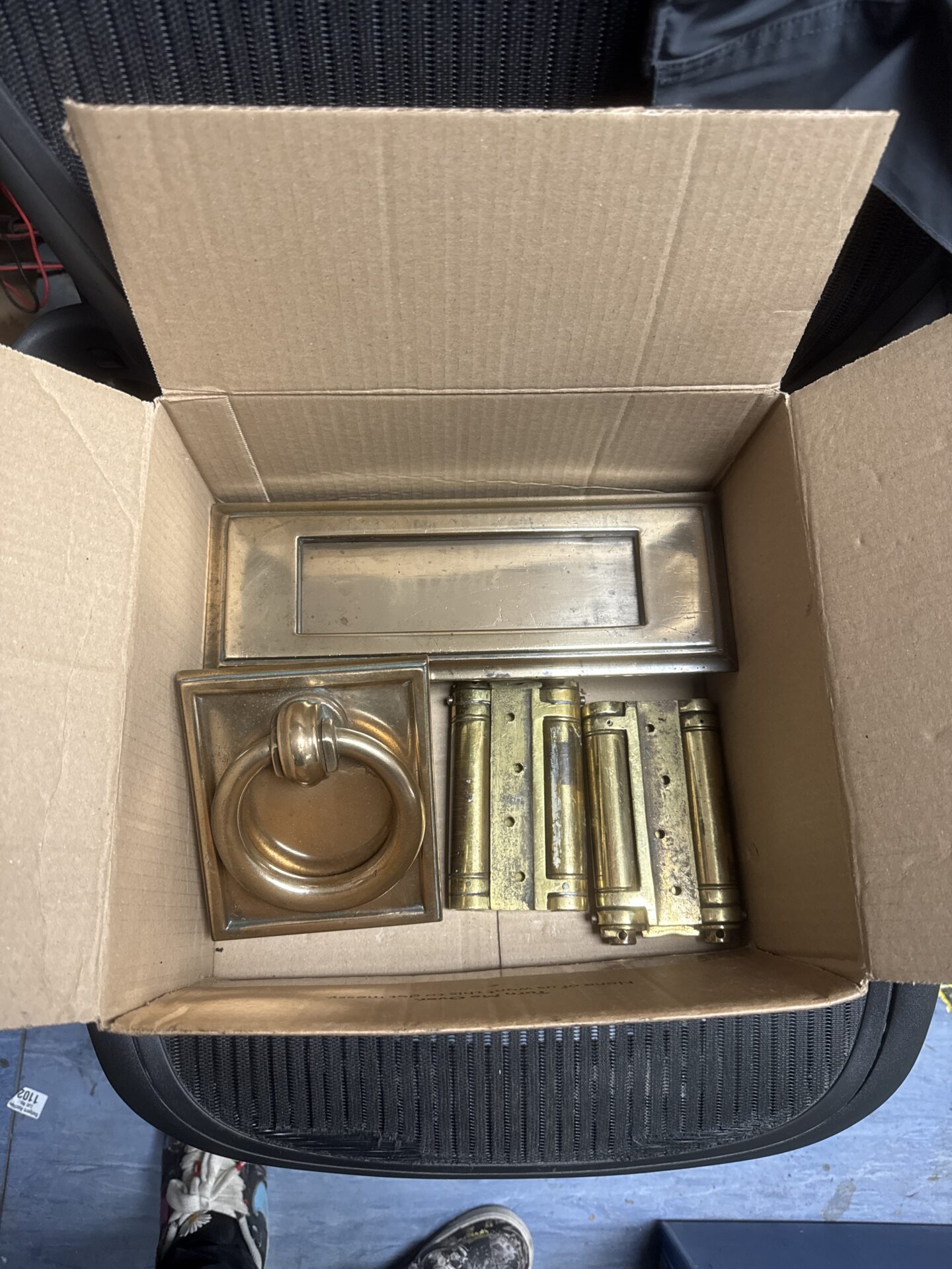 This lot comprises a chunky metal door letterbox, a matching door handle, and a pair of large brass hinge sets. The hardware appears to be of substantial quality, suggesting a period origin, likely from the early to mid 20th century. The brass hinges are particularly noteworthy for their size and intricate detailing, indicative of a well-crafted and robust construction.