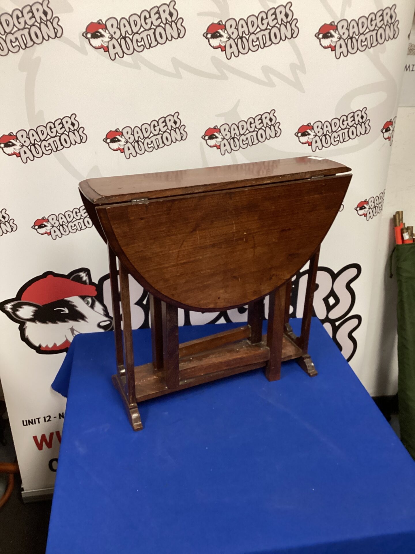 This is a vintage drop leaf table, constructed from wood. The table features a circular tabletop with leaves that can be folded down to create a smaller surface area, or extended for more space. It stands on four legs, offering a stable base. This table would have been a functional and decorative piece in a home setting.