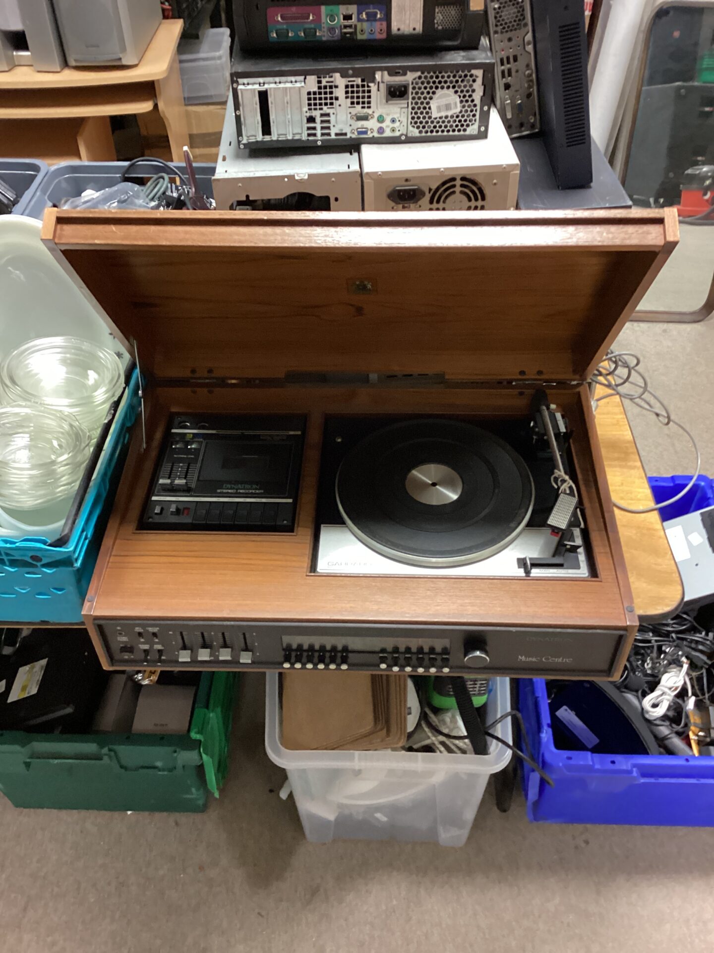 This Dynatron music centre is presented for restoration or use as a display piece. The unit shows signs of age and use, with cosmetic wear consistent with its vintage. It may require servicing to restore full functionality, making it an ideal project for a vintage audio enthusiast or collector. Its original design and the inclusion of a Garrard turntable make it a desirable piece for those interested in classic hi-fi equipment.