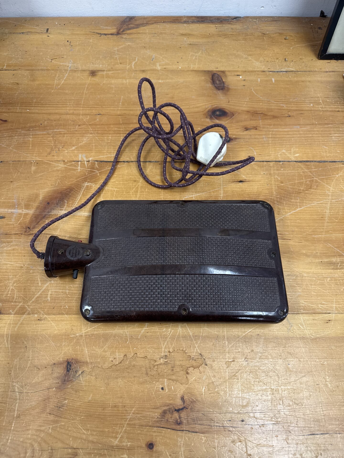 This is a vintage electric bed warmer manufactured by R A Rothermel, dating back to the 1930s. Constructed from Bakelite, this warming pad was designed to be placed under the bedsheets to provide comforting warmth on cold nights. The Bakelite casing is characteristic of the era, offering durability and a distinctive aesthetic.