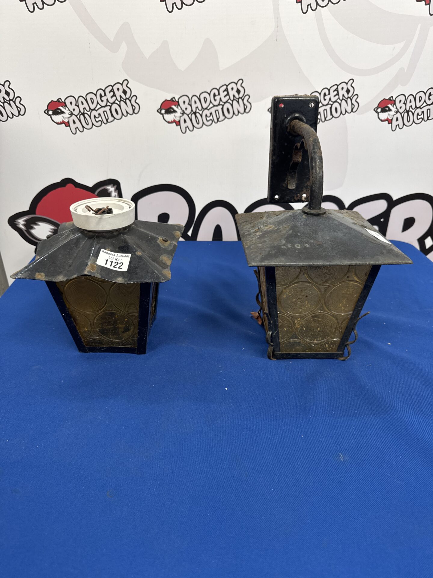 This lot comprises two vintage electric lanterns, exhibiting a classic design reminiscent of early 20th-century outdoor lighting. Crafted from metal, these lanterns feature intricate detailing and a dark finish, adding to their antique charm. The lanterns are designed for wall mounting, and their construction suggests they were intended to provide a warm, ambient glow.