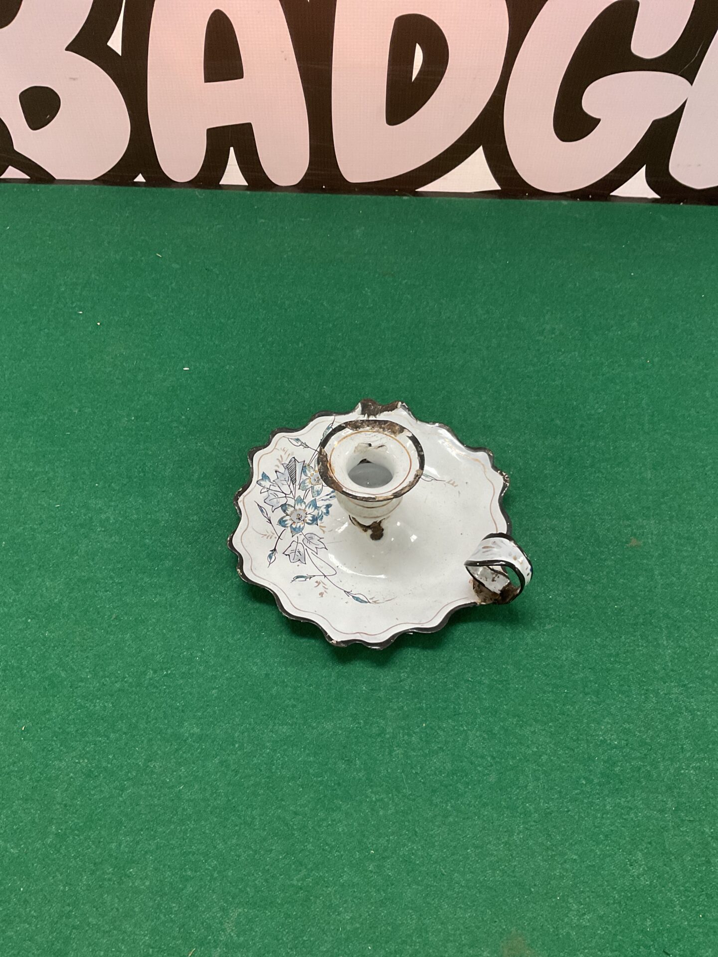 This vintage night light shows signs of age and wear consistent with its history, adding to its character. While there may be minor imperfections in the enamel or porcelain, these do not detract significantly from its overall appeal. Collectors of antique lighting or Victorian decor will find this piece a delightful addition to their collections, offering a glimpse into a bygone era of bedside illumination.