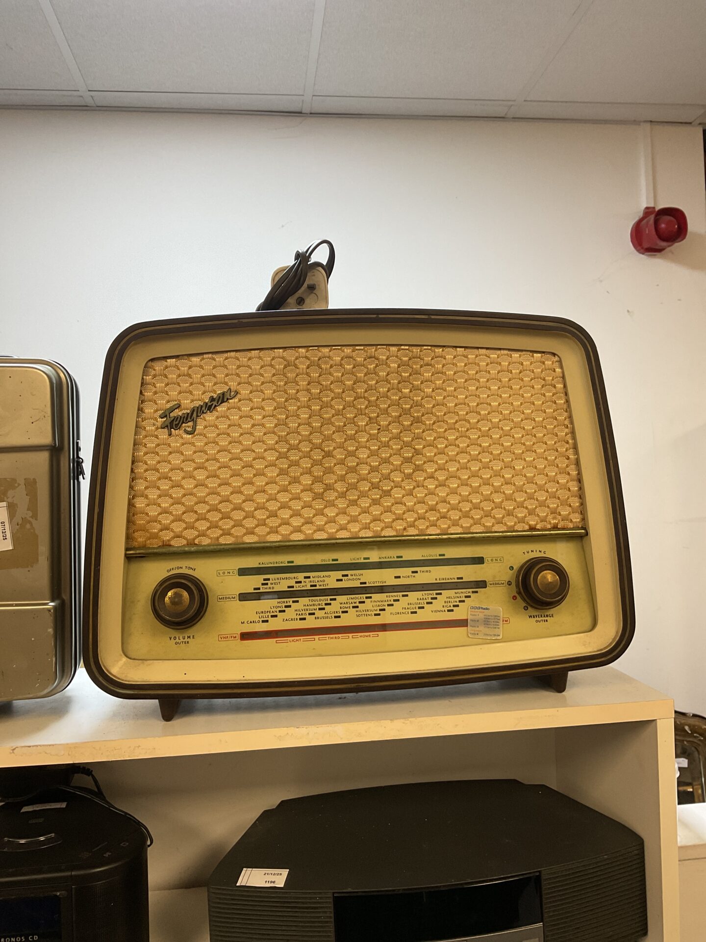 This is a vintage Ferguson valve radio, a classic example of mid-century electronic design. The radio features a wooden cabinet, a dial tuner, and likely operates using vacuum tubes (valves) to receive AM/FM broadcasts. It represents a bygone era of radio technology and offers a nostalgic aesthetic.
