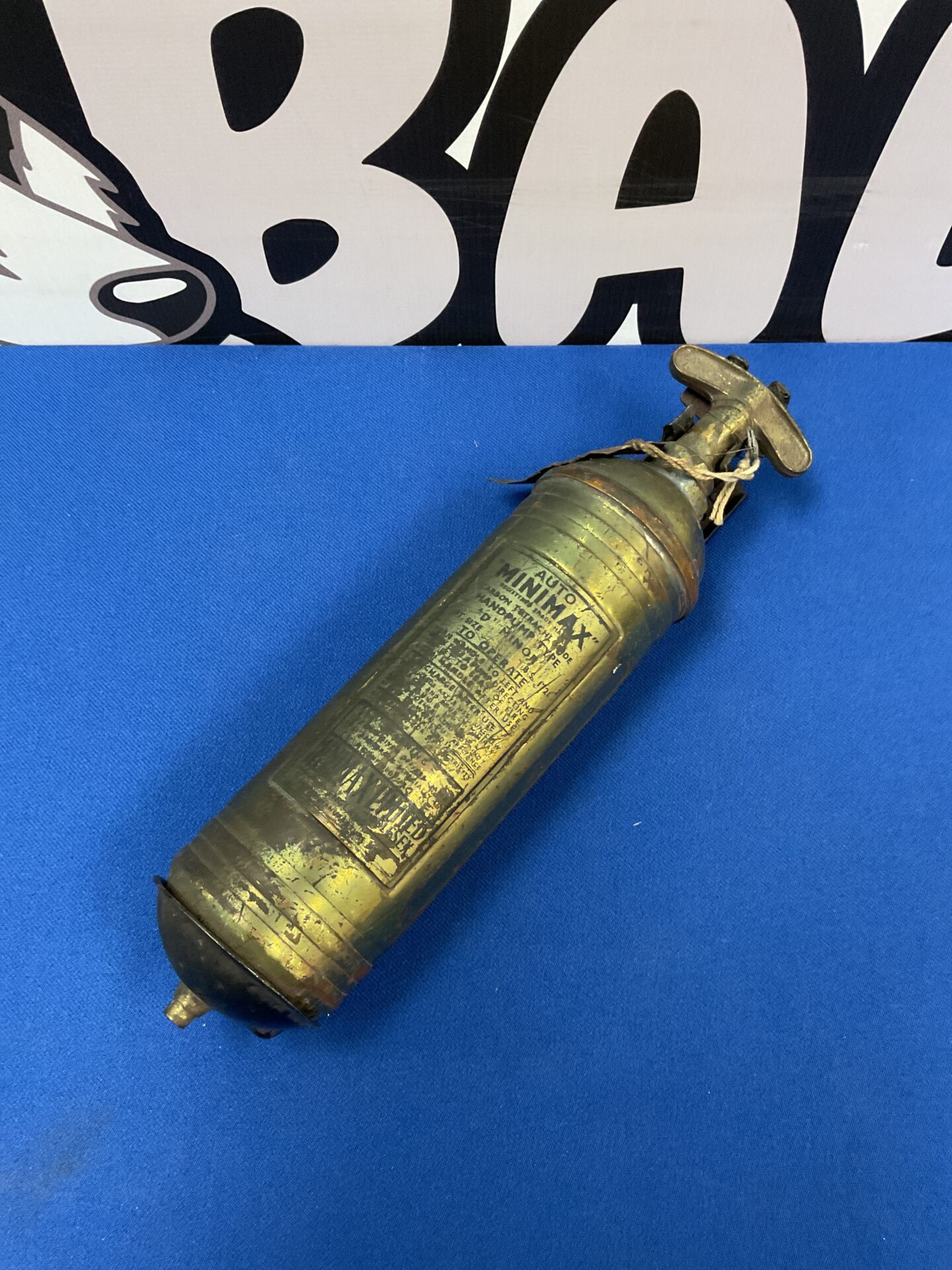 The extinguisher shows signs of age and use, with some patina and wear to the brass, which adds to its authentic vintage charm. It appears to be largely original, with no obvious modifications or replacements. This Minimax extinguisher would be a fantastic addition to any classic car restoration project, vintage tool collection, or as a unique display piece for enthusiasts and collectors alike.