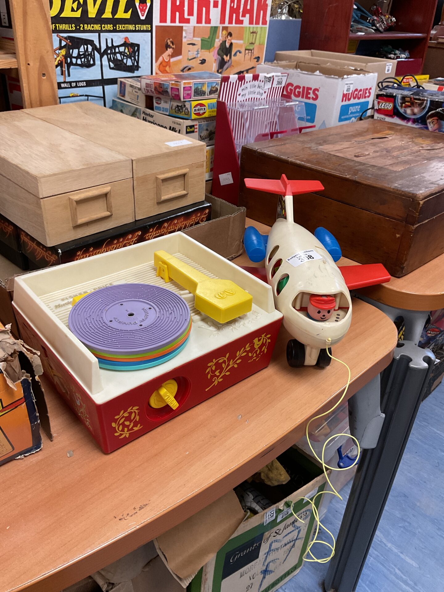 This Fisher Price record player is in good vintage condition, showing some signs of wear consistent with age and play. The colours remain vibrant, and the mechanism functions smoothly. It’s a highly sought-after collectible for those who remember this iconic toy from their childhood, or for collectors of vintage Fisher Price items. This piece would make a wonderful addition to any toy collection or a charming display piece.