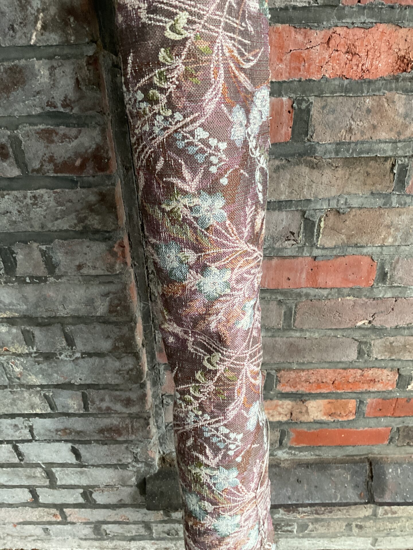 This is a substantial roll of vintage floral fabric, featuring a repeating pattern of delicate blooms and foliage on a muted background. The fabric appears to be a medium-weight material, suitable for a variety of applications including upholstery, crafting projects, or creating unique home decor items. The aged aesthetic and distinctive floral design evoke a sense of nostalgia and timeless charm.