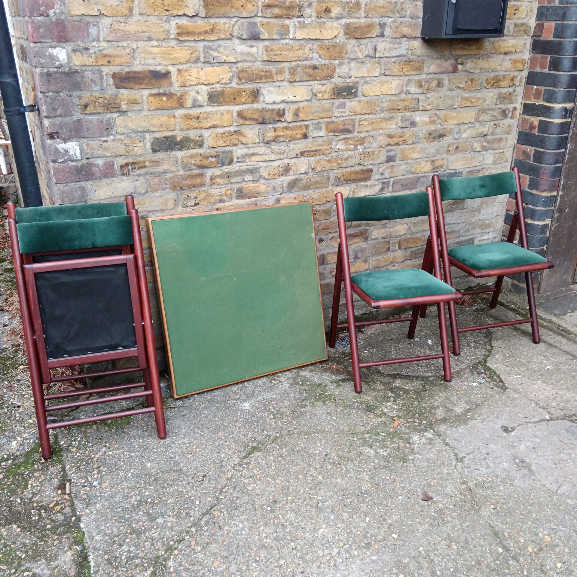 This set comprises a folding card table and four matching folding chairs, likely dating to the mid-20th century. The table and chairs feature a rich, dark wood finish and are upholstered with green vinyl seats. The design is practical and space-saving, making it ideal for smaller living spaces or occasional use. The set’s aesthetic leans towards a classic mid-century modern style, offering a touch of retro charm.