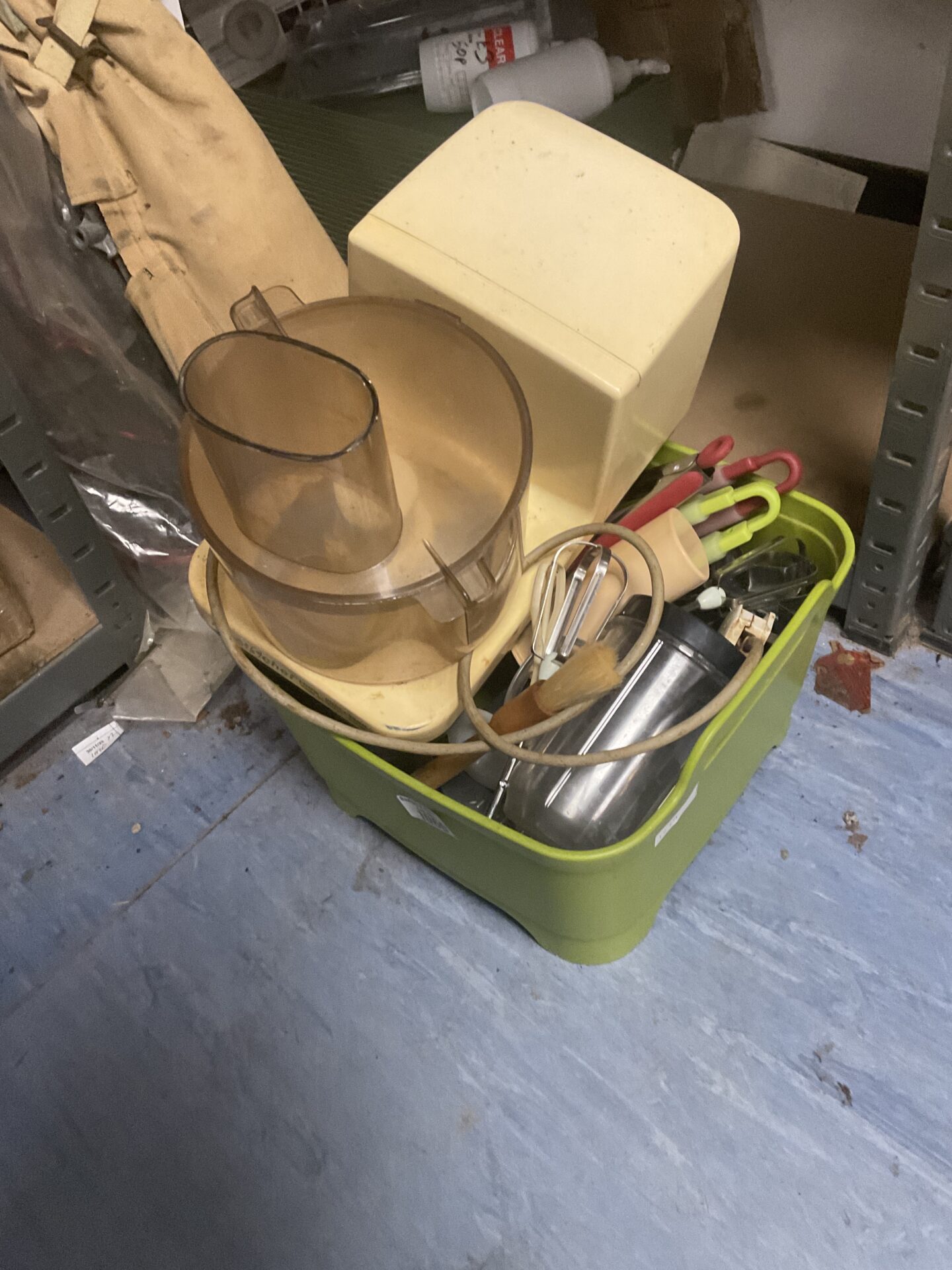 The food processor appears as a mixed lot with various kitchen items. The condition of the processor and its attachments is not fully discernible from the image, and it is sold as-is. This vintage Robot Chef food processor would be of interest to collectors of retro kitchen appliances, enthusiasts of vintage technology, or those seeking unique kitchenalia for display or restoration.
