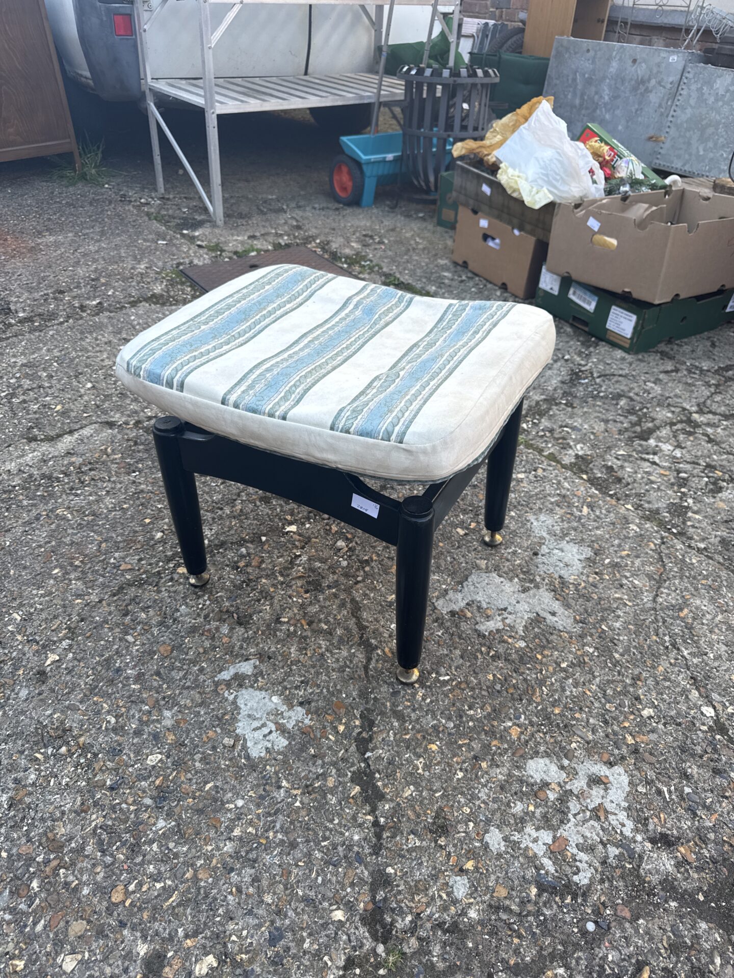 This vintage 1970s E Gomme footstool offers a touch of mid-century style. Featuring a patterned upholstered top and tapered wooden legs, it’s a versatile piece for any room. While showing some signs of wear and staining, it remains structurally sound and full of character.