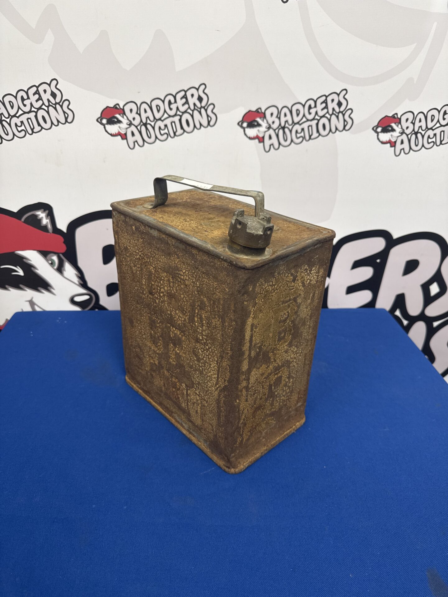 This is a classic vintage BP (British Petroleum) motor spirits fuel can, instantly recognisable by its iconic branding. The can features a brass Shell cap, adding to its authenticity and charm. These cans were commonly used for transporting fuel for vintage cars, motorcycles, and other machinery, and are now highly sought after by collectors of automobilia and vintage petroliana.