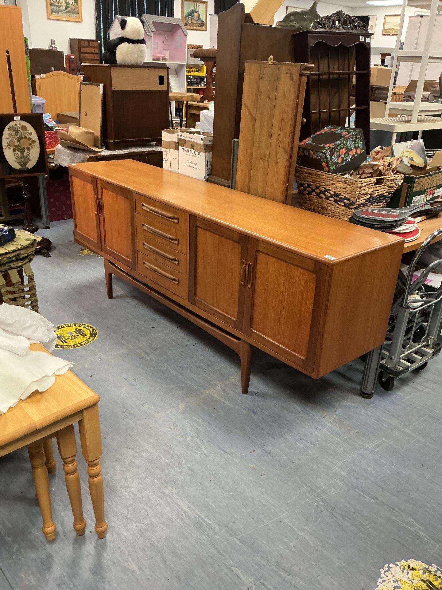 This is a classic vintage G-Plan sideboard, a hallmark of mid-century modern design. Crafted from teak, this sideboard features clean lines, a low profile, and ample storage with both cupboards and drawers. The design embodies the Danish modern aesthetic, popular in the 1960s, and offers a functional yet stylish addition to any home.