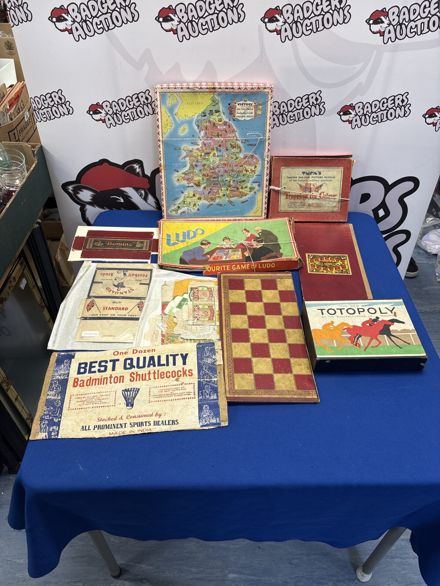The items present signs of age and use, consistent with their vintage nature. While the condition varies across the lot, these pieces hold appeal for collectors of vintage games, advertising memorabilia, or those interested in retro toys. The collection offers a unique opportunity to acquire a piece of history and add to an existing collection or start a new one.