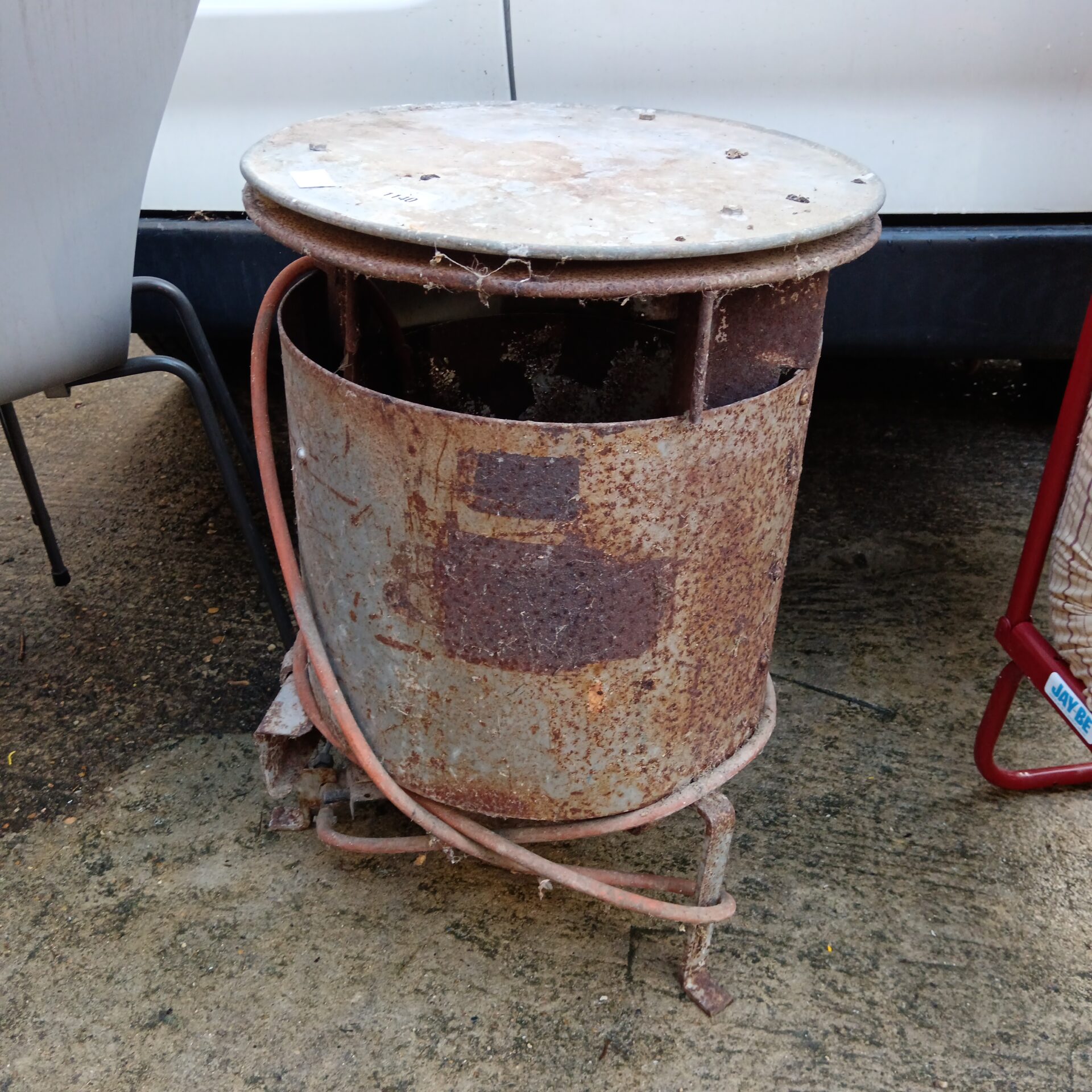 This is a vintage gas heater, constructed from galvanised steel. Its cylindrical form and robust construction suggest it was designed for outdoor or industrial use. The heater features a simple, utilitarian design, indicative of its era, and a handle for portability.