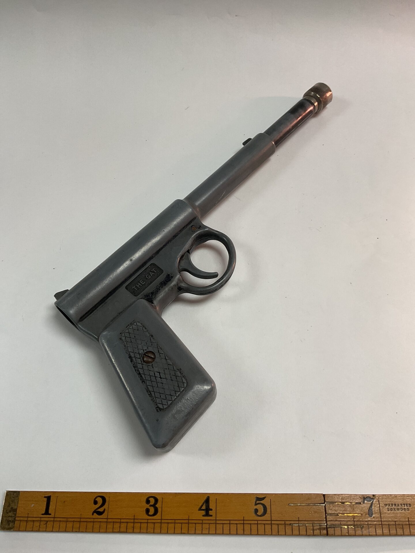This is a vintage “The Gat” air pistol, a classic example of mid-century toy design. Constructed with a tinplate body and featuring a spring-loaded firing mechanism, this pistol evokes a nostalgic era of play. The pistol’s design includes a faux wood-grain finish on the grip and barrel, adding to its realistic appearance.