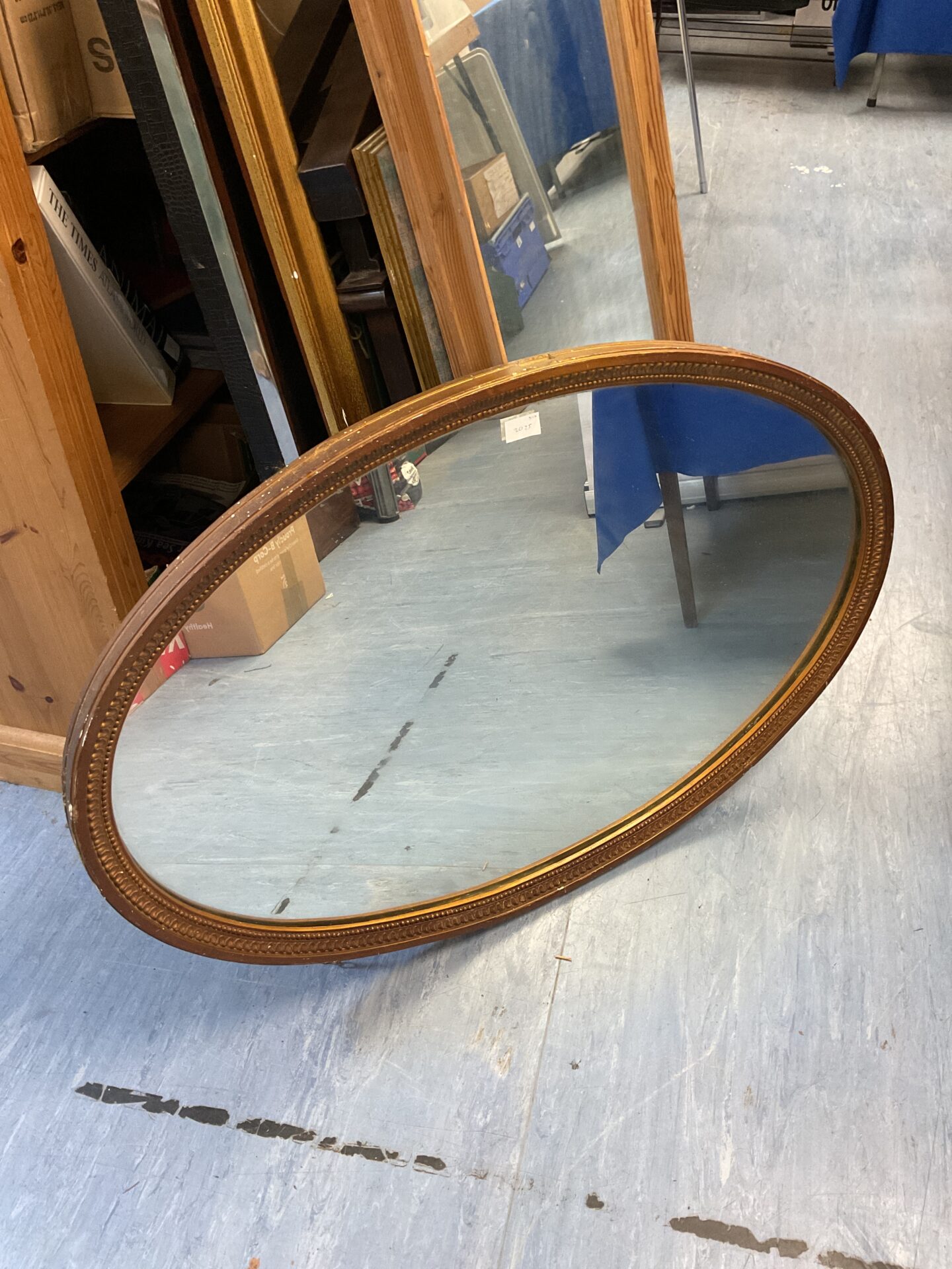 This is a beautiful vintage oval mirror, boasting a richly gilded frame. Measuring 100x65cm, this mirror would make a stunning addition to any hallway, bedroom, or living space. The ornate detailing of the frame suggests a classic style, likely dating from the mid-20th century, and adds a touch of sophistication to its overall aesthetic.